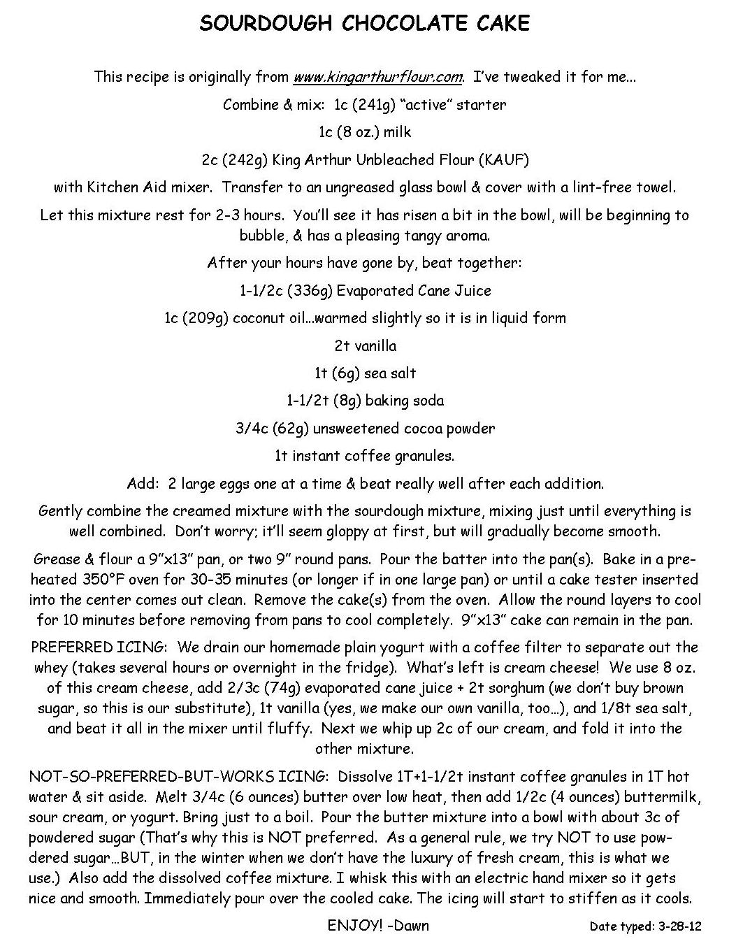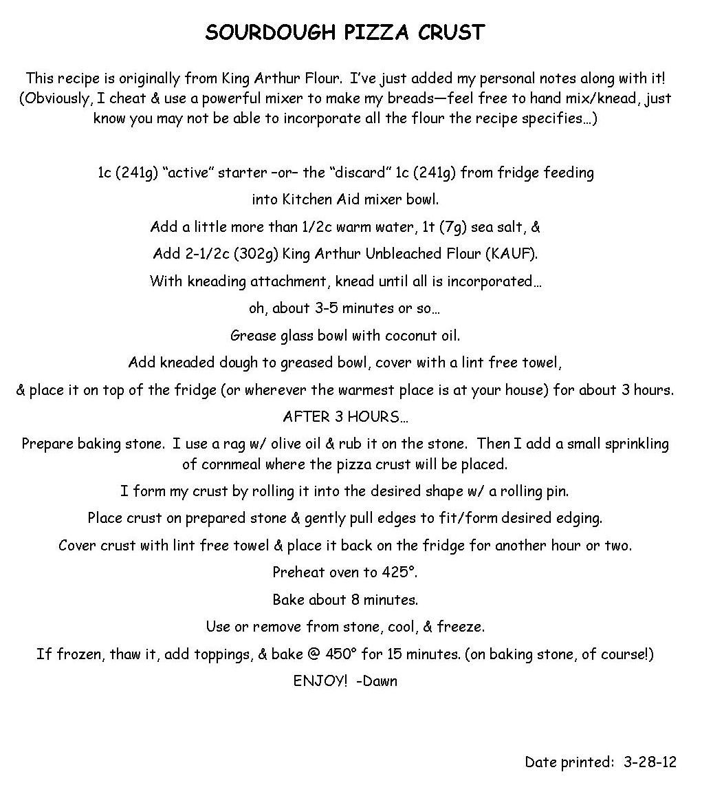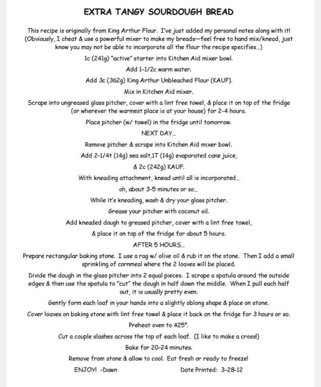 Thought I’d try to get some of my sourdough recipes posted. For the past 11 years, we have not had to purchase our daily bread from the store. π It used to be soooo frustrating to read the labels on the bread at the bakery outlets (where we used to go & buy a bunch & freeze it). Even many of the “healthy” breads had soy or high fructose corn syrup in them! As we began to research the health benefits of using natural leaven, we knew it was something we wanted to try. We purchase 50# bags of Sir Galahad, King Arthur Unbleached Flour at Yoder’s in Minerva.