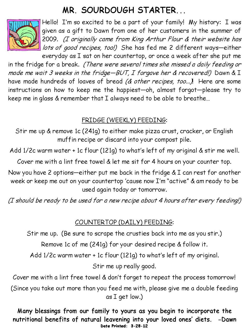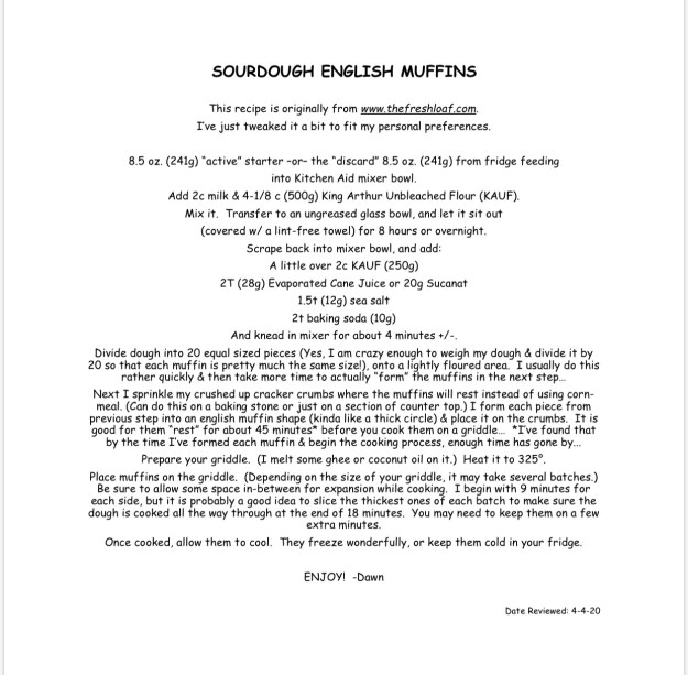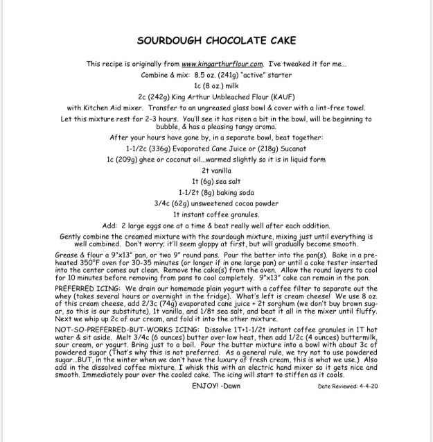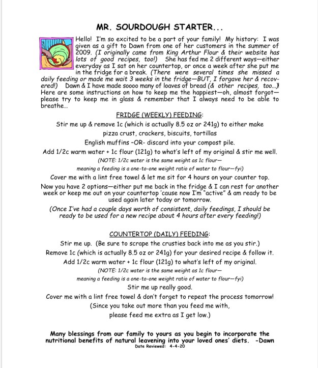 Fortunately for me, my starter is very forgiving π I’ve made many mistakes, but never so bad that it didn’t recover… I use my starter daily for a couple weeks straight. I make an assortment of bread, pizza crusts, crackers, & english muffins. These are all my “staples”, because they freeze really well. (We all really enjoy a chocolate cake recipe, too!) Once I have a nice stash in the freezer for us and our customers, I’ll put the starter in the fridge for a week or so to get a bit of a break. It can be a little overwhelming at first, but once a routine is established, it really goes pretty smoothly. If anyone ever wants a “start” to try, I’m always happy to share. And anytime anyone wants to “shadow” me to see what I do, you are welcome to come out – just check with me the day before to be sure my starter is out & “active”! π