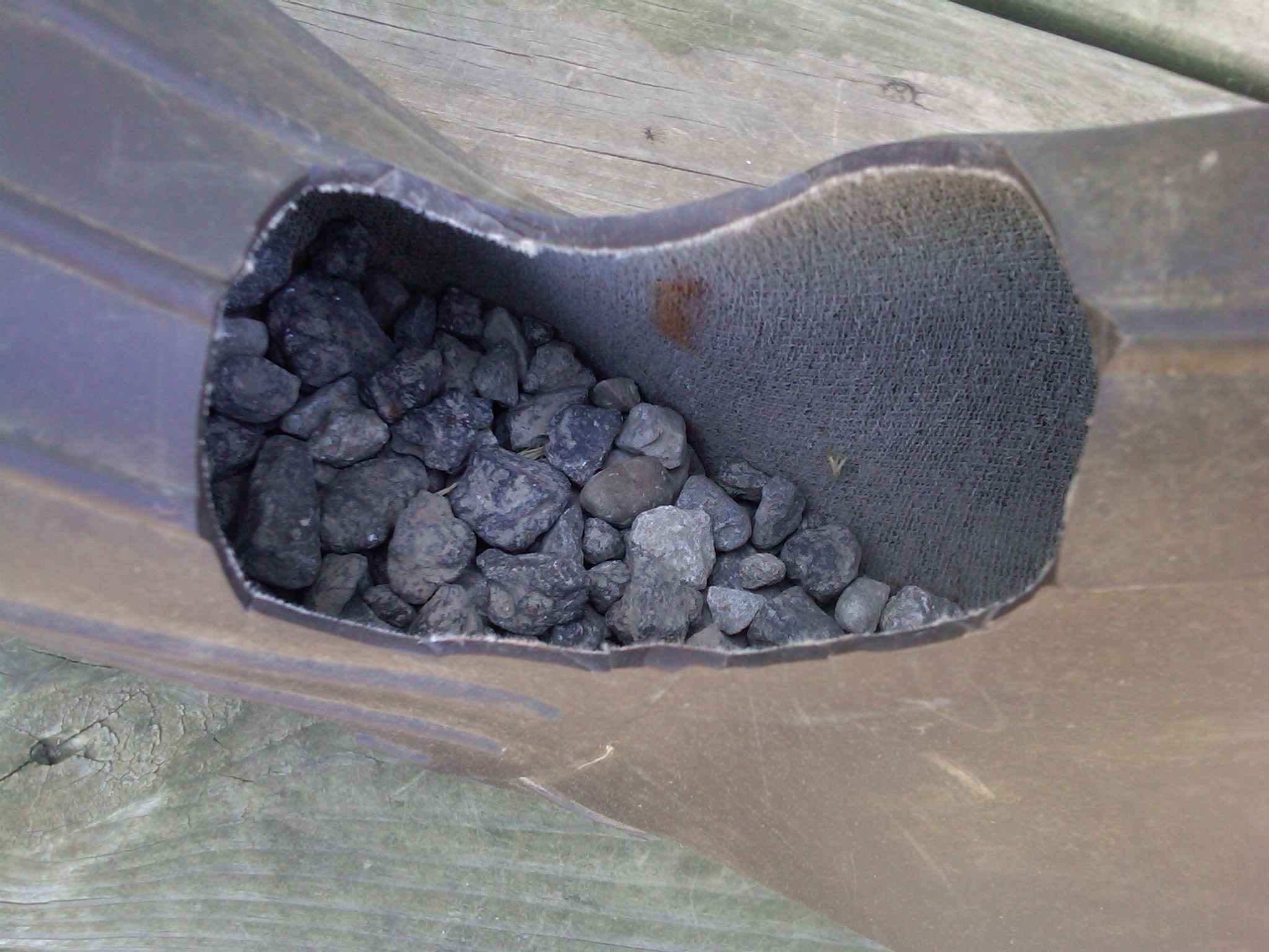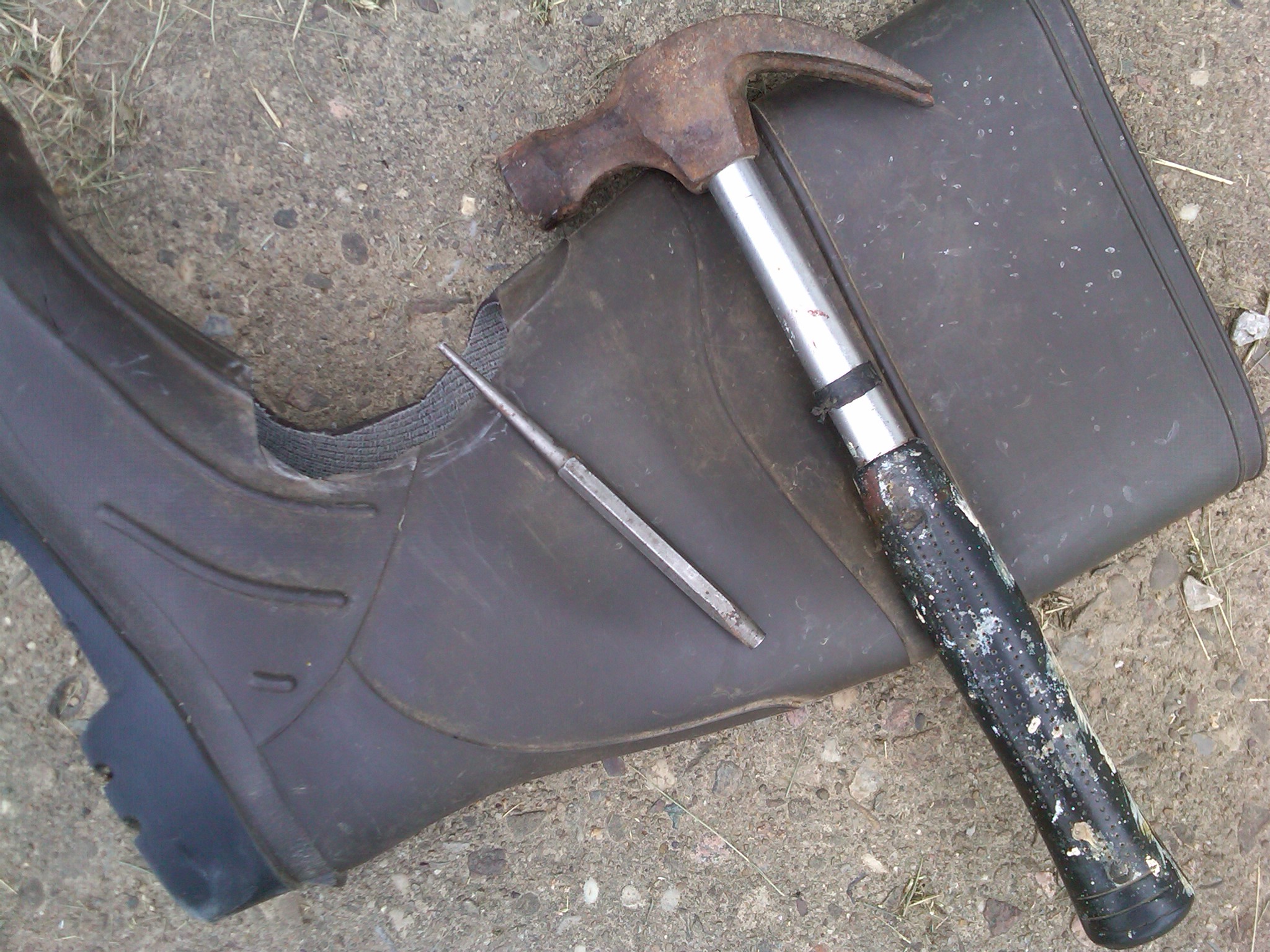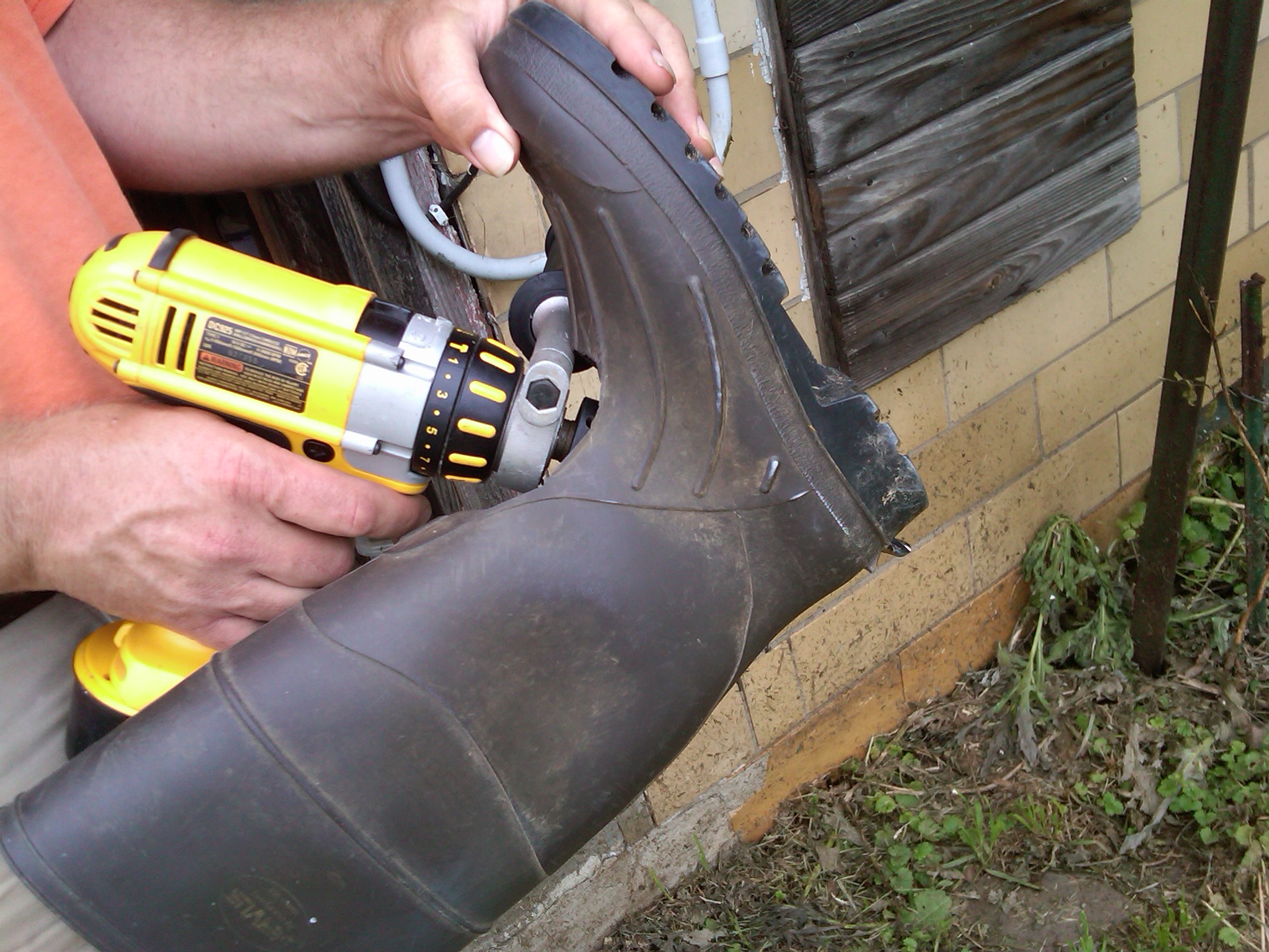 Next, I poked drainage holes through the bottom of the boot. I knew better than to use a hammer to pound a screwdriver through the boot (I had made that mistake once before…), so I THOUGHT I was being ever-so-wise as I dug through Mike’s toolbox… and found this…