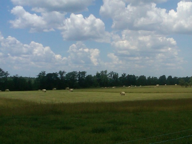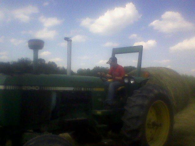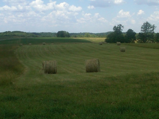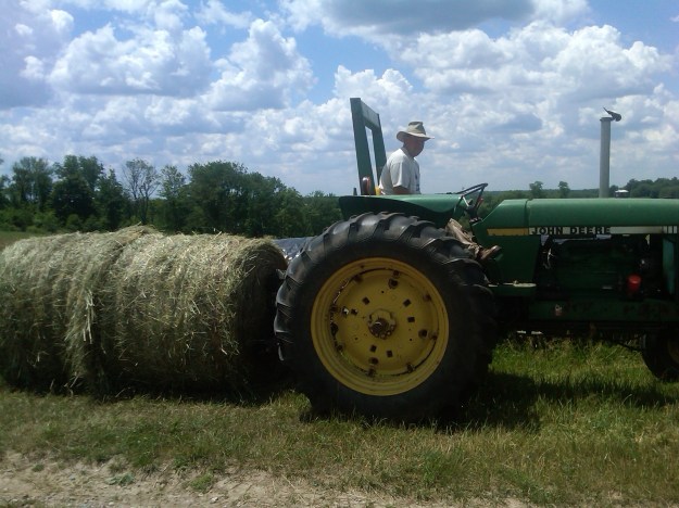 This week, Mike worked with a good friend of ours, in hay. We don’t own a roundbaler or rake, so they coordinate their tasks & help each other out. While Bill roundbales here, Mike squarebales at Bill’s. 🙂