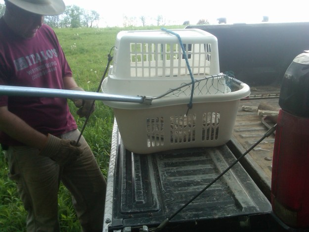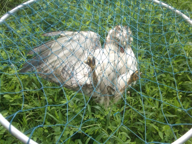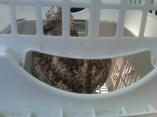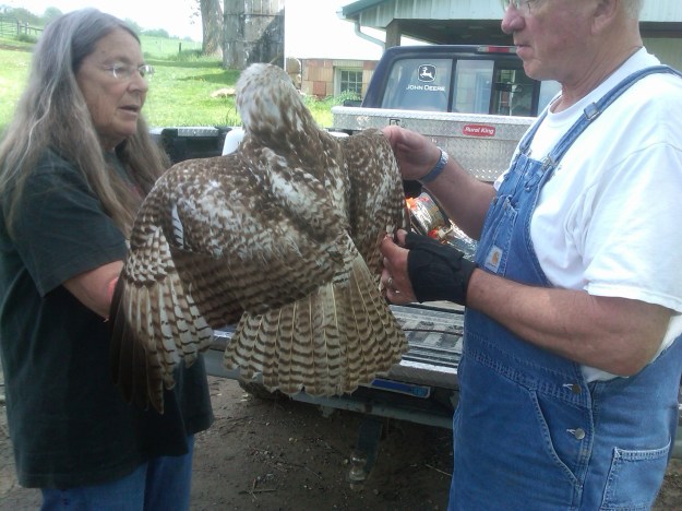 Mike & Michael had been moving cows up in Gray Heaven, when they noticed a hawk walking around pretty close to them. They thought perhaps it was a younger one learning to fly, so they watched it and stayed away. All week Mike kept saying how much he wished he would have caught that hawk… Well, that wish came true! The following week, he was in Gondor & saw the SAME HAWK walking in the woodline. Now he started thinking something might be wrong with it, because as he got closer, it didn’t fly or even try to fly away. He made some phonecalls, and found a rescue farm not far from us who said they’d take it if he could catch it! OH WAS HE EXCITED!!! 🙂