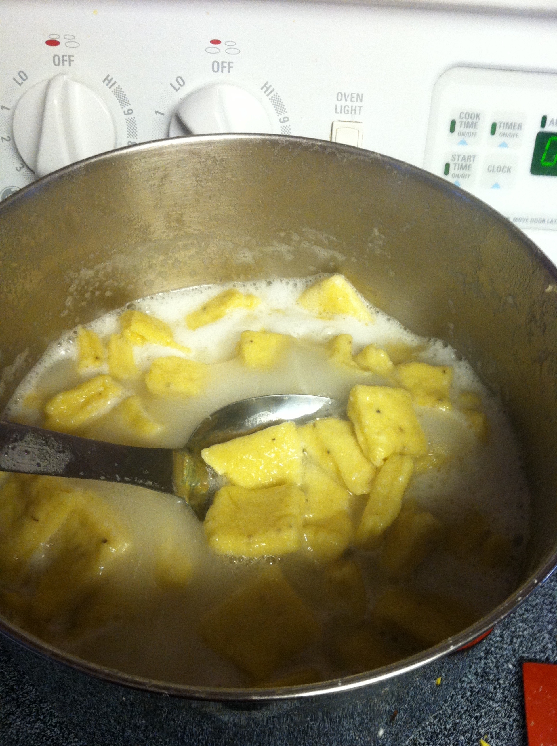 Water should be boiling by now. Drop dumplings in water and boil 4 minutes. Usually takes me about 4 batches to get all the dumplings cooked. Stir just to make sure there aren’t any stuck to the bottom of the pan. (Oh – and you may need to lower the heat on your burner. That should help prevent water from boiling over. Yeah, I always learn the hard way, lol!) Remove dumplings with a slotted spoon or hand-held strainer & place in a colander to drain. This way you can keep re-using the same pot of water to make all the dumplings. πŸ™‚