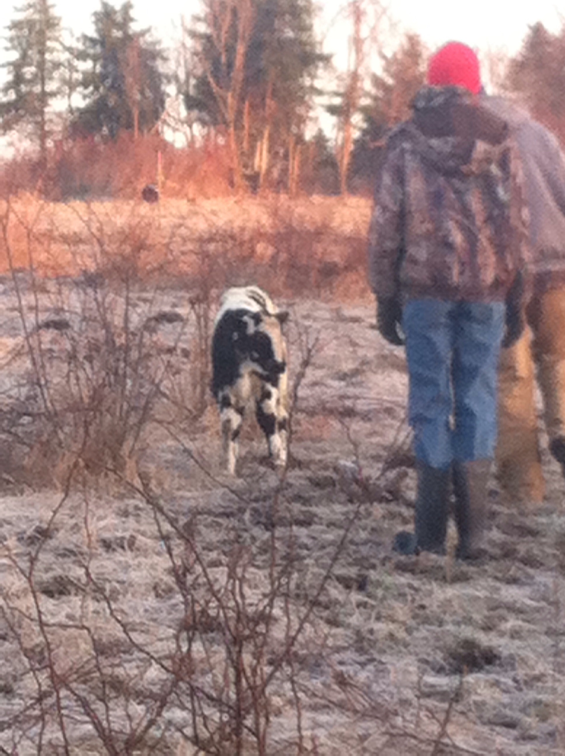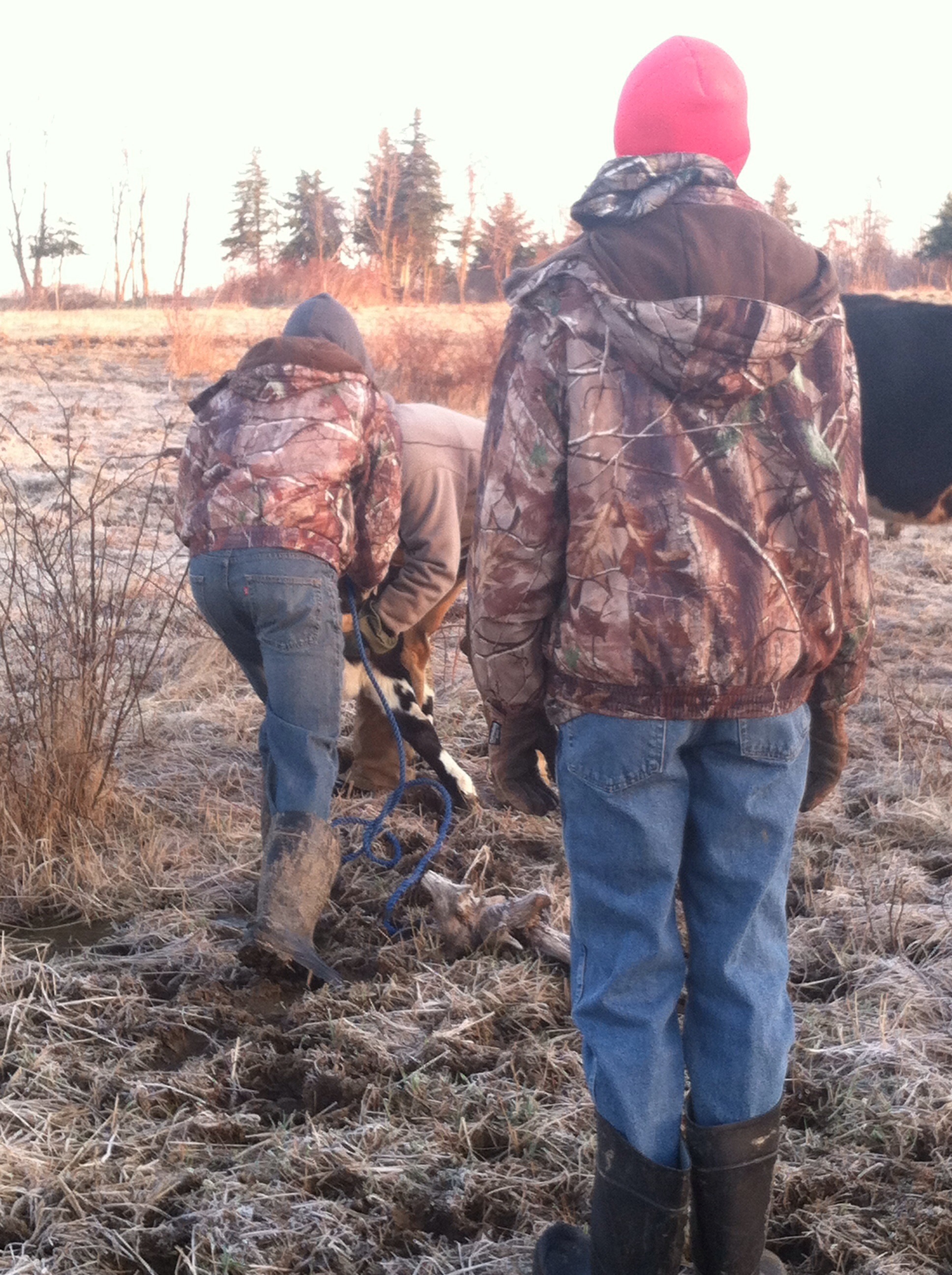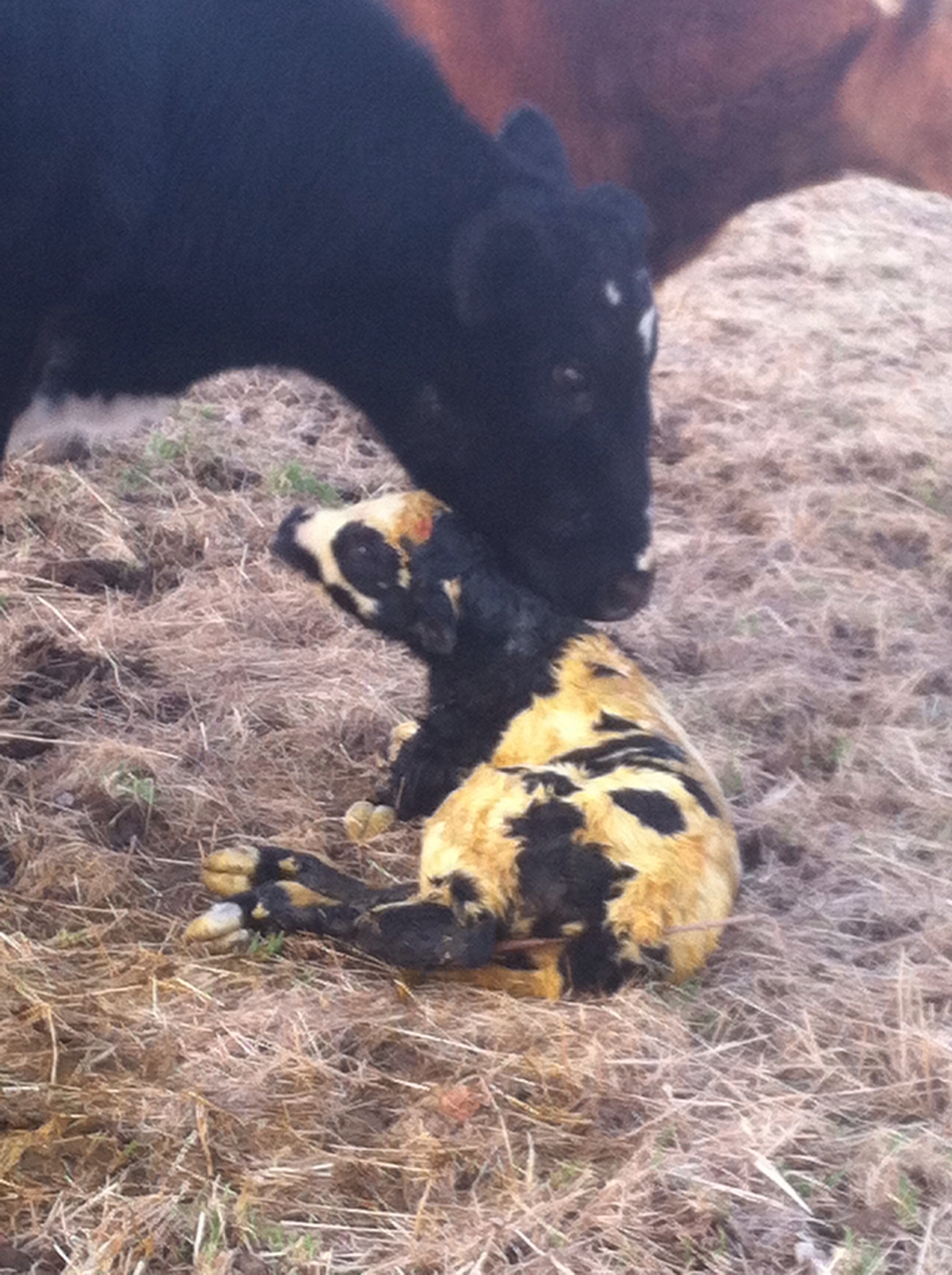 I left Mike with her, and drove back down to get some twine in case Mike needed to assist with pulling the calf out. But when I returned, he had already been born! π