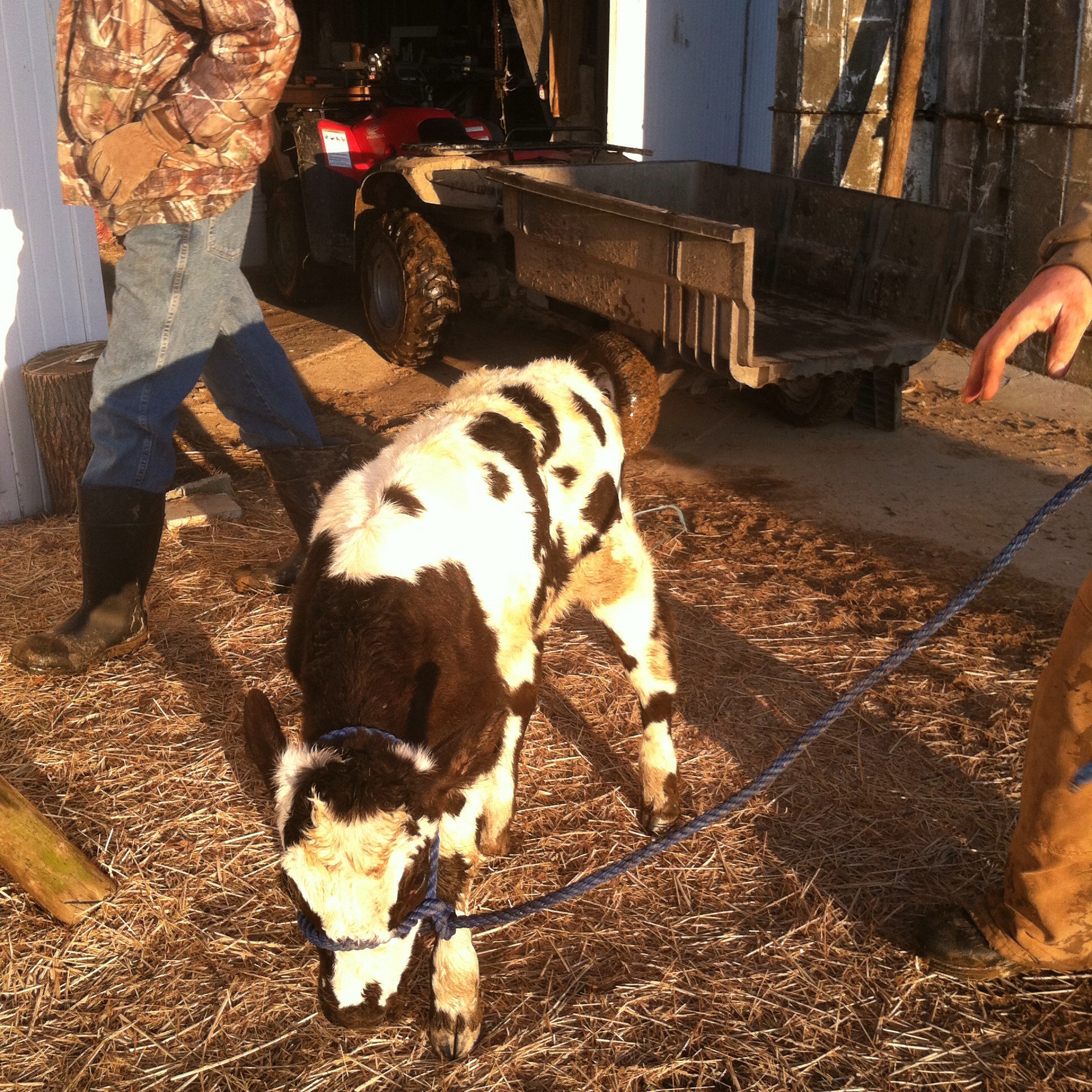 ThomasJefferson walked with his mama out of the field, and then she completely left him, lol! She got through that gate, and just started truckin’ to the barn! Well this little guy is NOT SO LITTLE, and needs to grow into his long legs, so we decided he’d get a wagon ride down. He filled up the whole wagon, lol! His markings are pretty cool – and we are debating if we will keep him as a bull. π