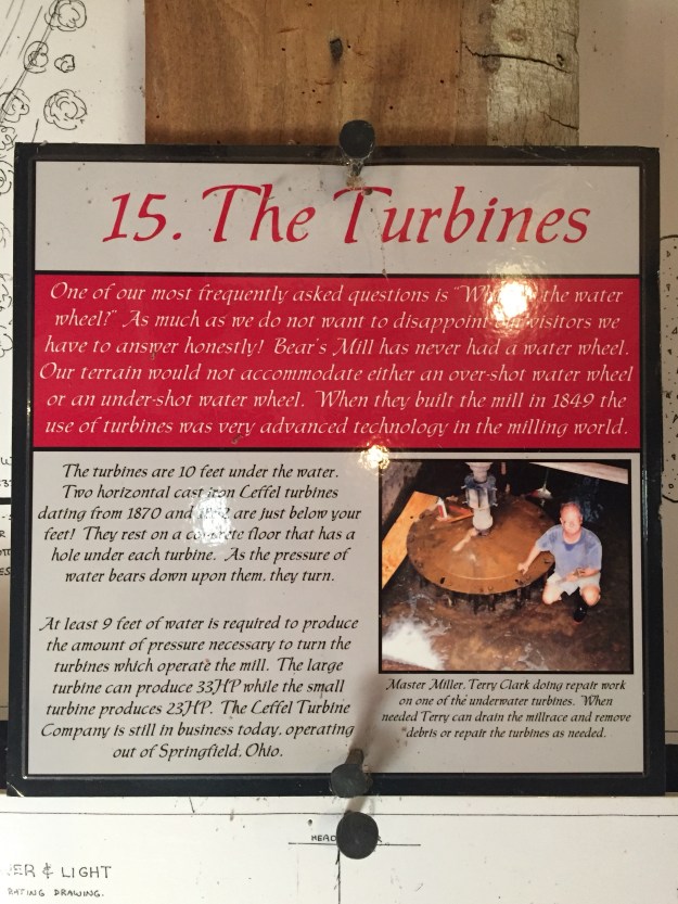 Next stop was to Bear’s Mill. Found it when searching for places to visit on our route, and knew it would be a great stop for us. [Click here to see our posts about the steam powered Algonquin Mill that is near and dear to our hearts in Carroll County, OH.] Bear’s Mill is not powered by steam, however – it’s water powered, by a turbine. We enjoyed the self-guided tour. Here are some pics: