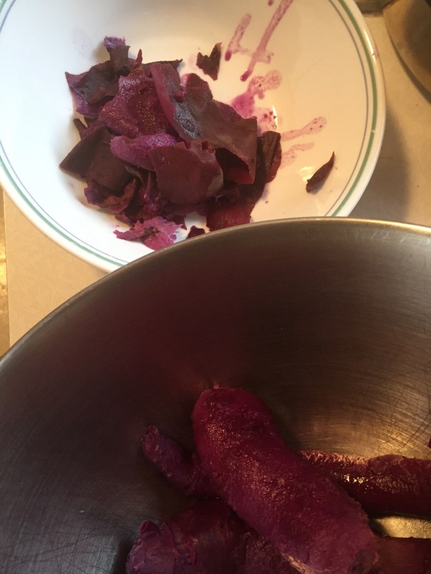 I have two sweet potato pie recipes in my collection. Decided to do the simpler one here, so we could get a better appreciation of the purple color. First I washed, and then boiled 1.2# pounds of taters for about 40 minutes.