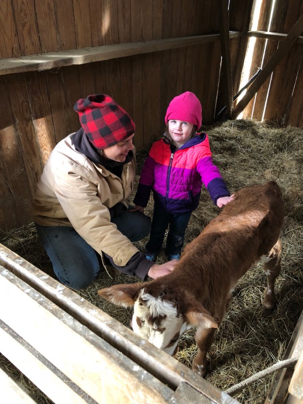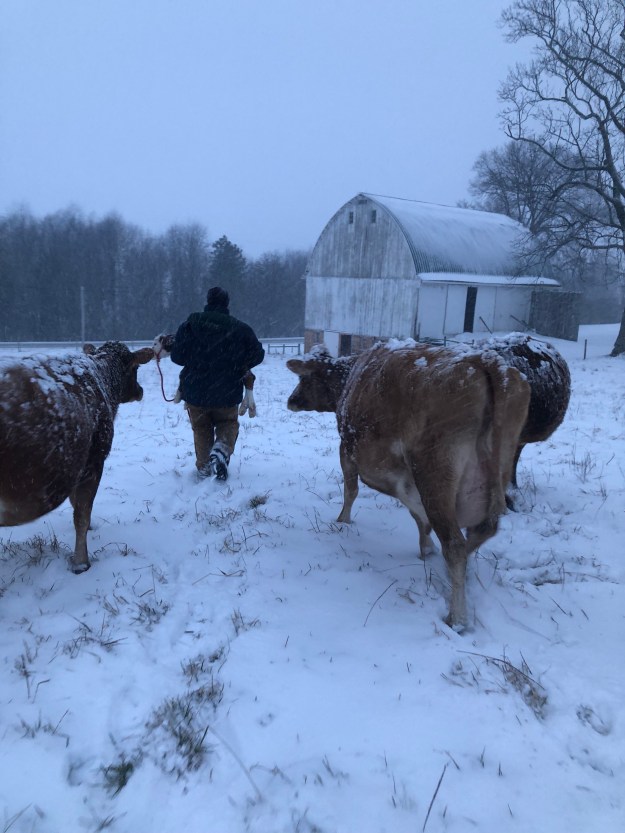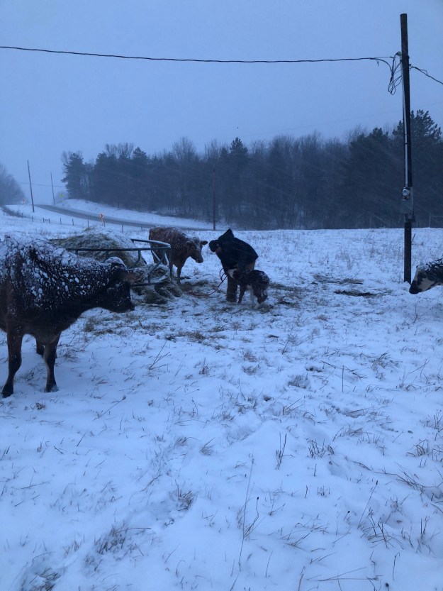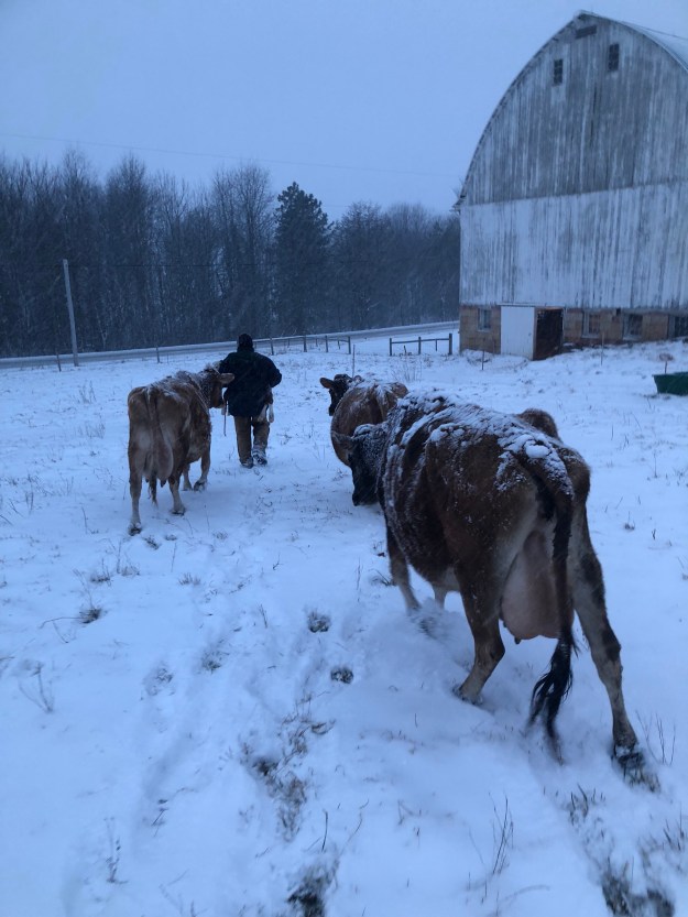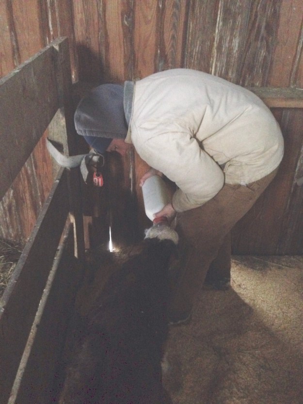 The snow was just starting to stick, and we had about an hour of daylight left, so we told Gluey she had one hour to prove she knew what to do… If he wasn’t cleaned up when we came back out, we’d bring him inside and milk Gluey so we could feed him ourselves.