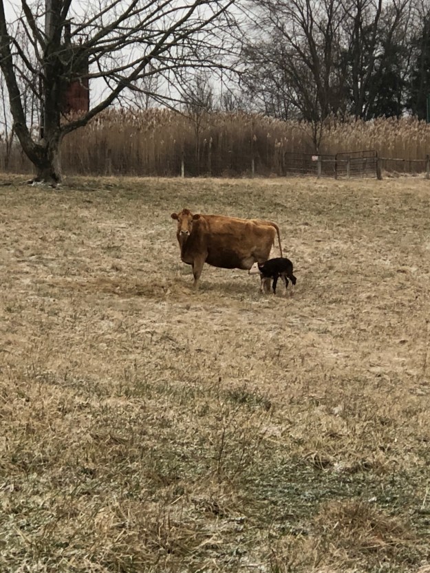 Could tell from a distance that the calf was a boy, and that he had just been born. He was still wet, and hadn’t eaten yet. Gluey has had 8 calves for us. This boy makes her count 4 girls and 4 boys.ππΌ