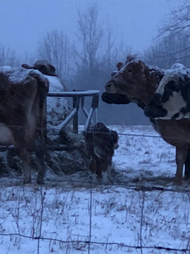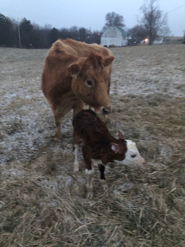 Last evening after work was done, showers done, and the 4 of us sat down to watch a movie together, the call comes: Gluey had her calf.π Figures, right?π This is always the hard part – had the girls’ been up in Grey Heaven, we would not have known she’d had her calf, so we would have found out in the morning. BUT, once we KNOW a calf’s been born, we just can’t NOT go and check on the situation…especially with a snowstorm on its way annnd Gluey’s past fiascos…π¬