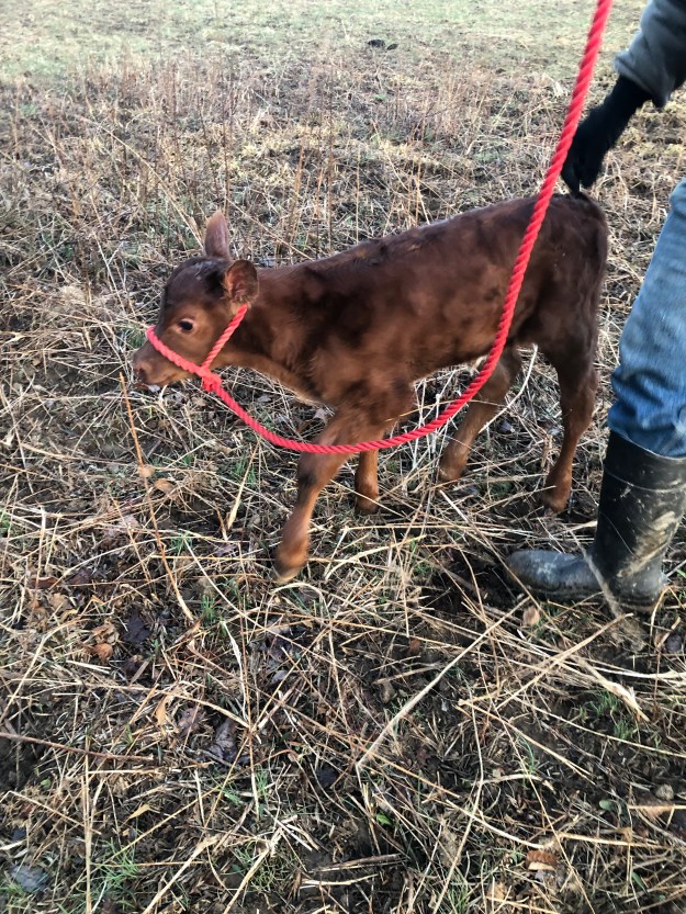 She’s a tiny little cutie. AND NOT ALL WHITE like our first 2 calves, lol. Amber is a beautiful shade of red/brown. She had a lot of spunky energy & made the trip down to the barn with no problems.👌🏼