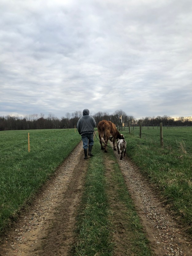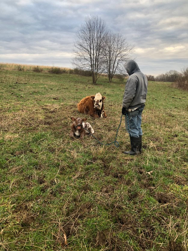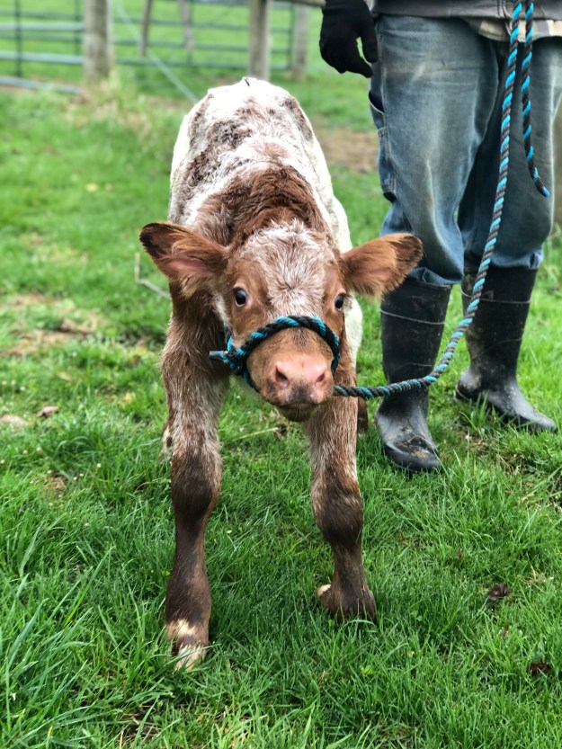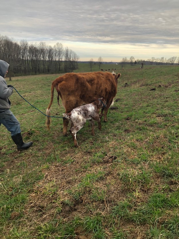 We were so pleased to see that Peggy (the first of the three heifers who are bred for this season), had delivered her first calf without any assistance and it was all cleaned up when we arrived in the field this morning! And how fun that it was so colorful!❤️ [Click here to read about when Peggy was born.]