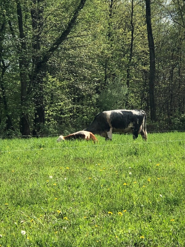As I’m taking pictures and videos of all this with Ruby, all of a sudden I hear a weird noise behind me. I turn around to seeing Gluey laying on the ground and pushing for a few seconds and then she popped up and started eating again. I asked Mike if he thought maybe Gluey was going to have her calf today, too?🤔🤷🏻♀️ Time would tell…