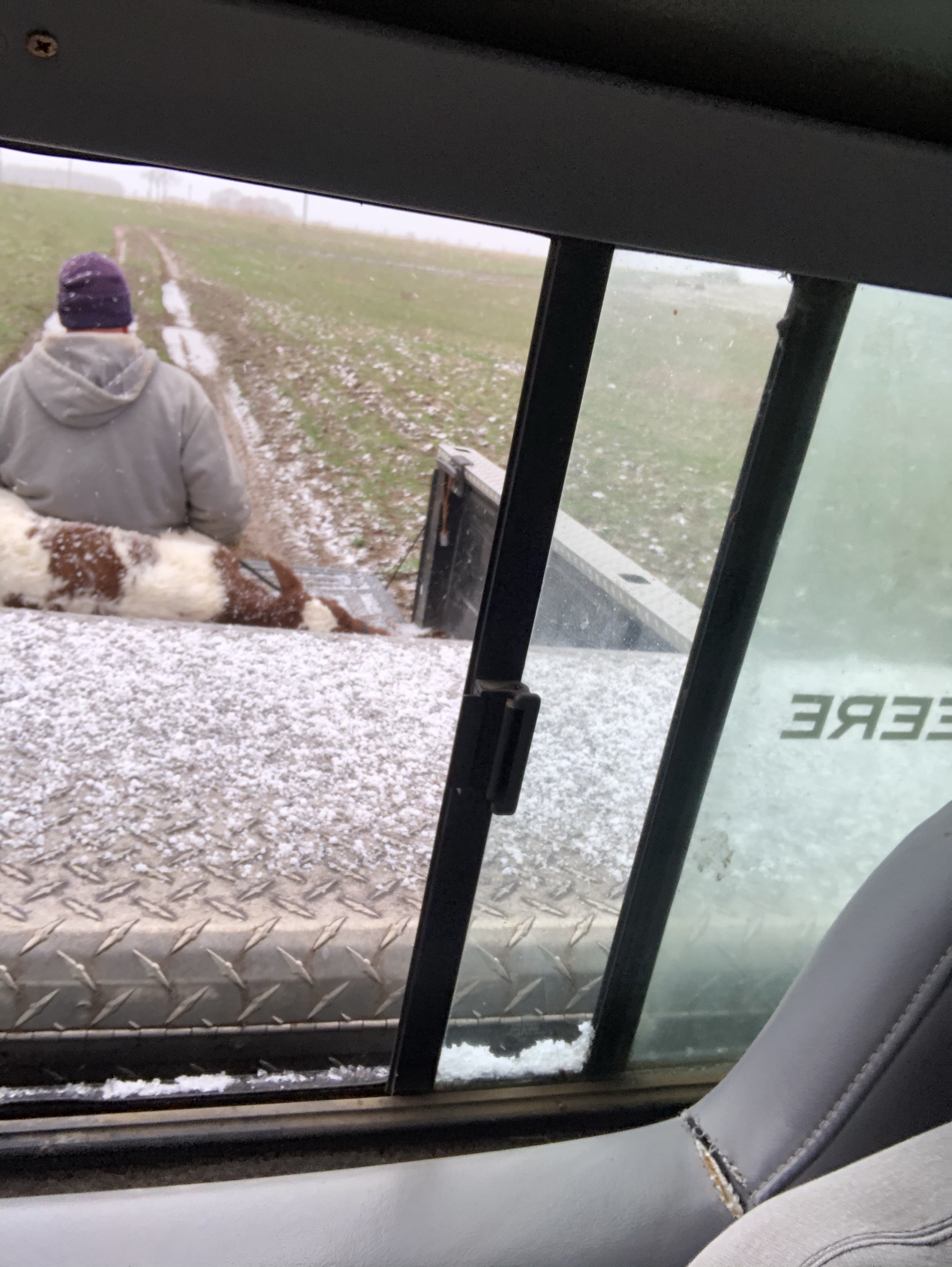 Ruby wasn’t the best leader, and it didn’t take long to see walking them both all the way down to the barn wasn’t going to work. Hank is HUGE, and Mike didn’t really want to pick him up…π¬ BUT – that’s the only way to get him onto the four-wheeler, so…πͺπΌ