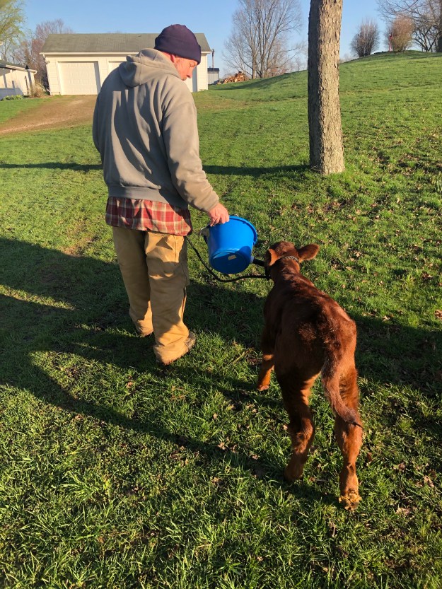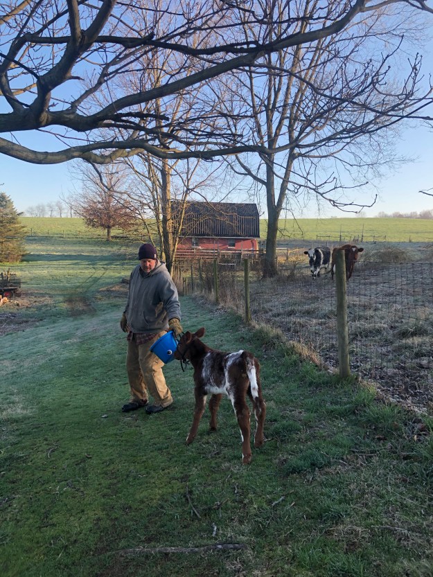 In anticipation of calf #4, we brought the three oldest calves over from the white barn on Thursday. Heidi went first, then Bucky, and lastly Roni. It is a delight to see them running around over here from our back windows.π