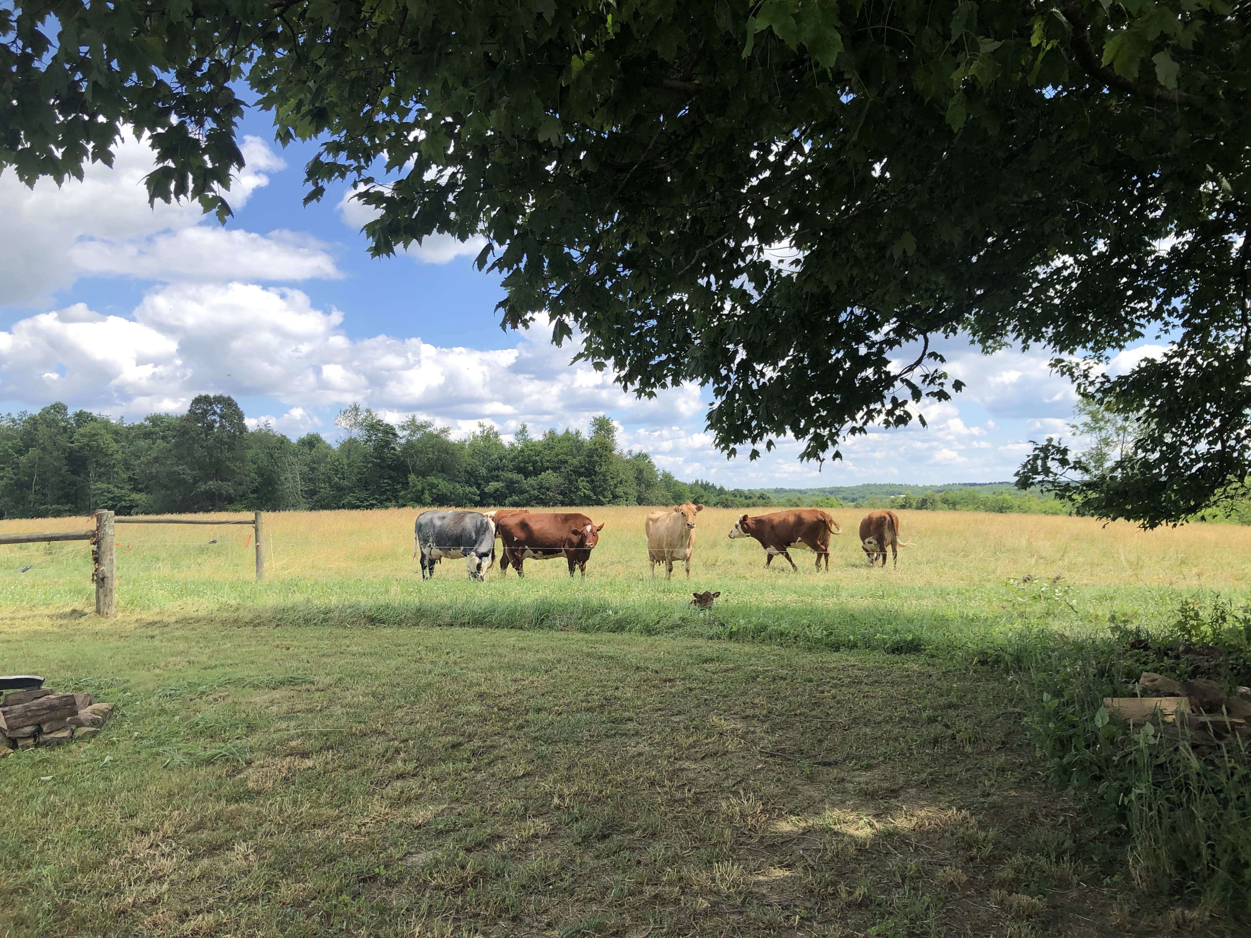 Paul actually was the one to find him. He had gone up on the hill to mow the campfire area he and Michael had made. The cows were up there staring at him, and so was an extra little guy, lol. Here is the pic he txted me. (Gluey is the light one with the goofy face, and Nat is the other one. Notice how the calf is drifting toward the one NOT his momma.๐๐คฆ๐ปโโ๏ธ)