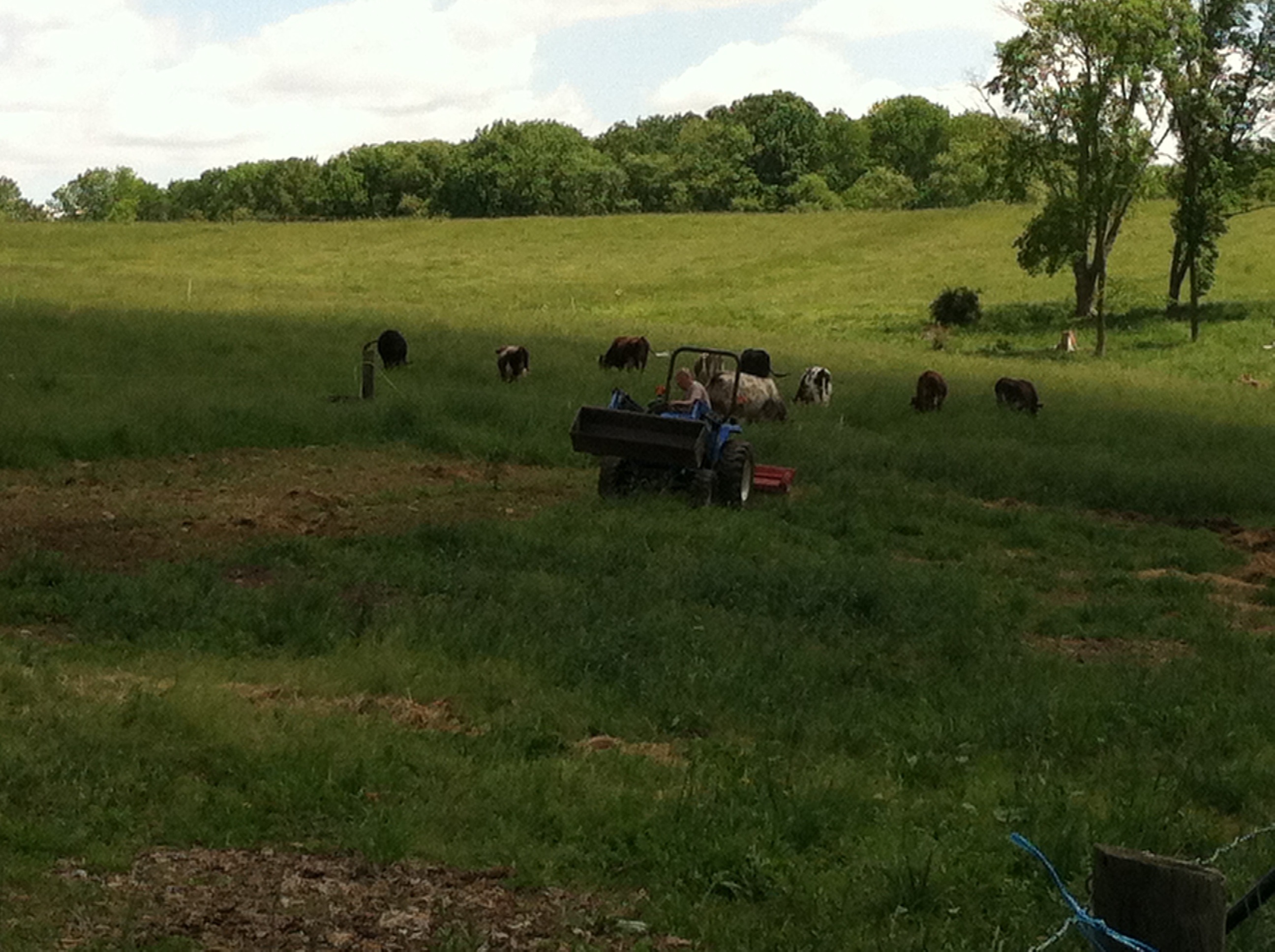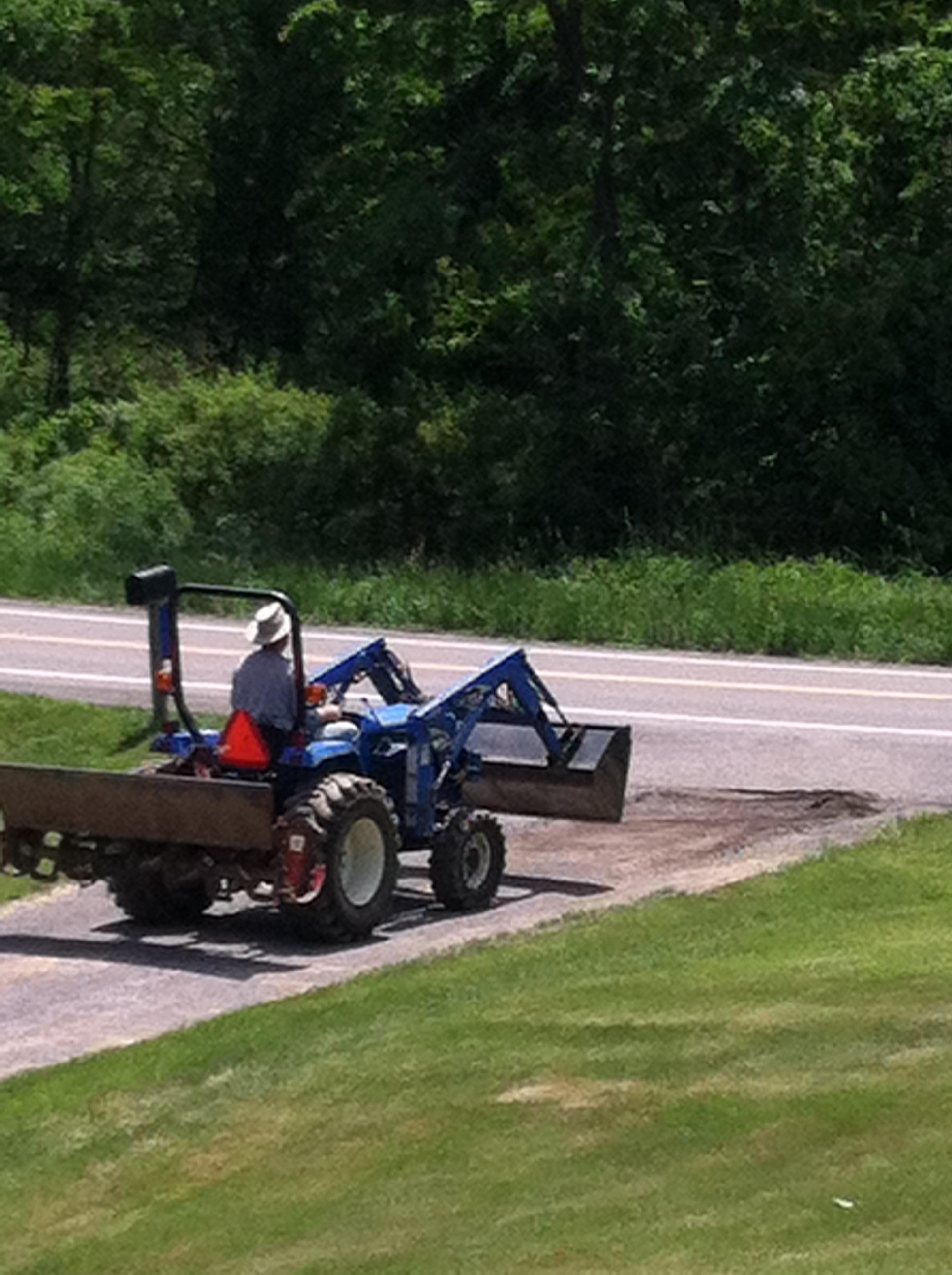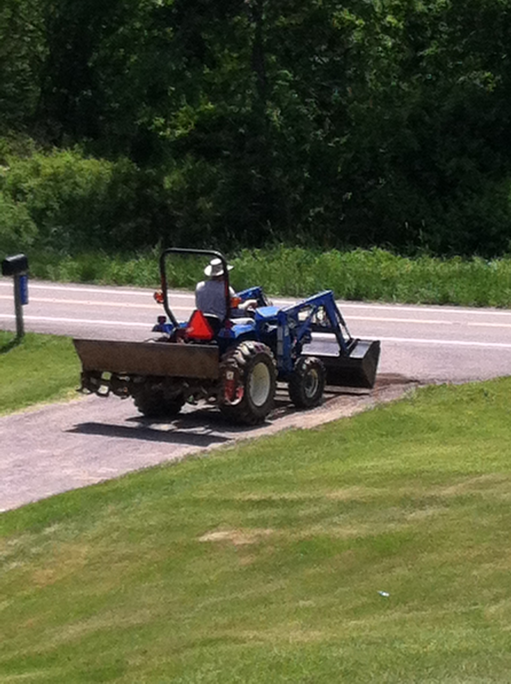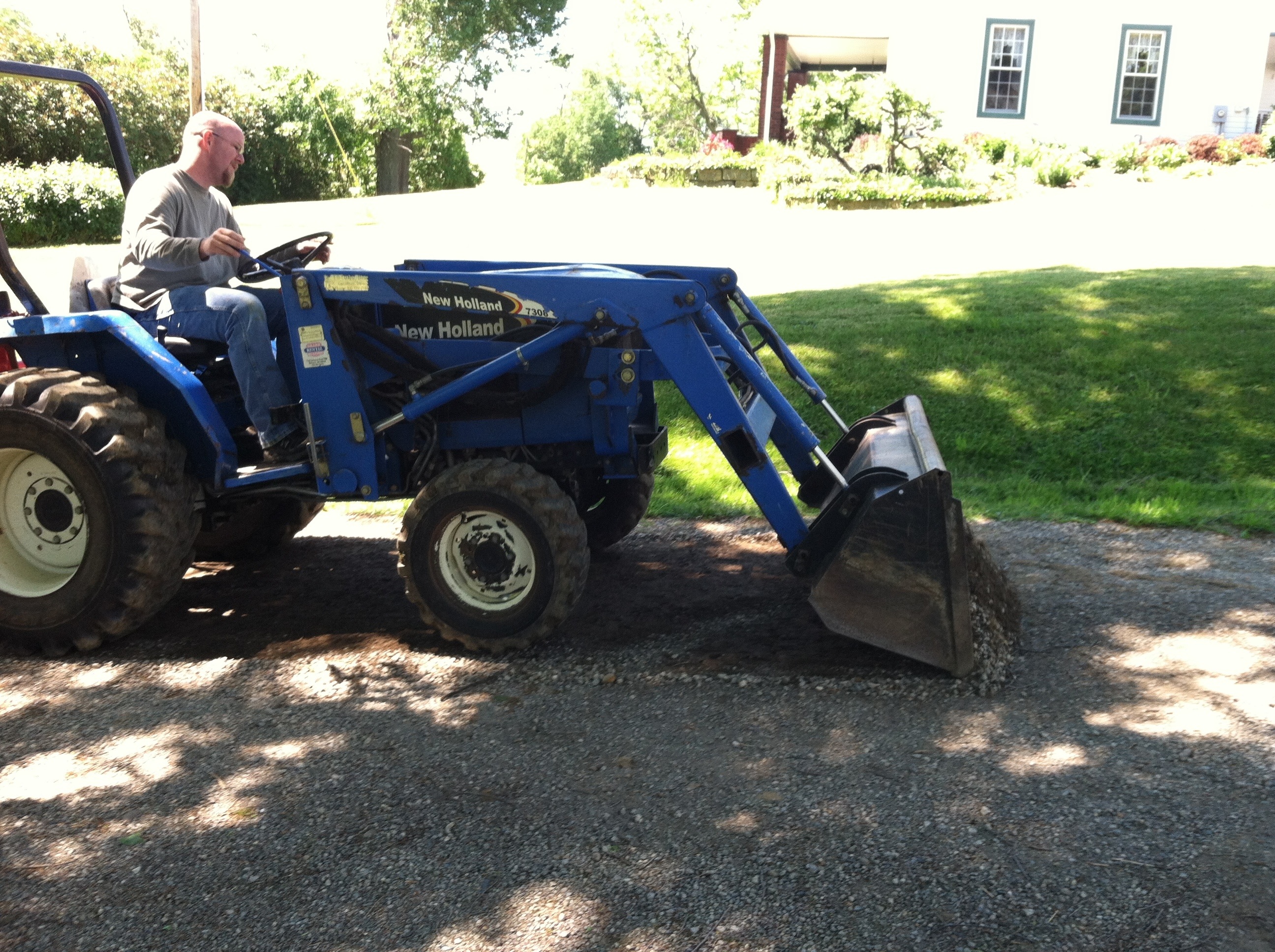 Next up was trying to fix Mike’s parents’ driveway. It washes out in spots, so this was an effort to patch it up for now. Mike’s brother got to “play” with the tractor, too… ๐