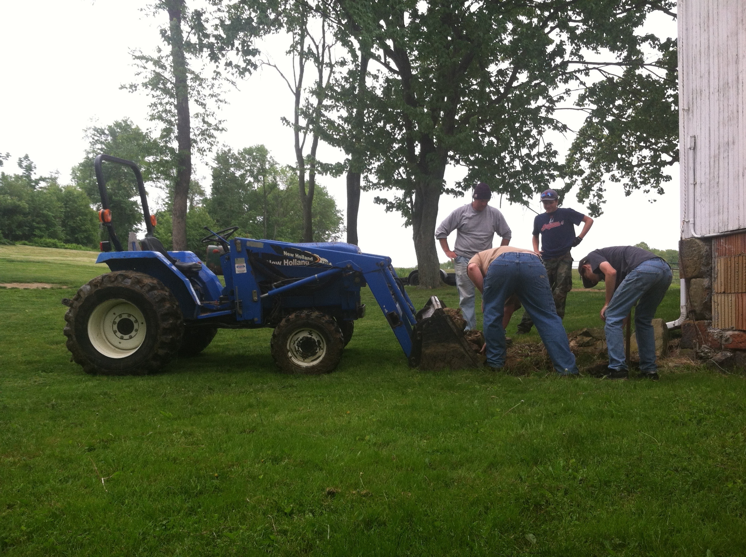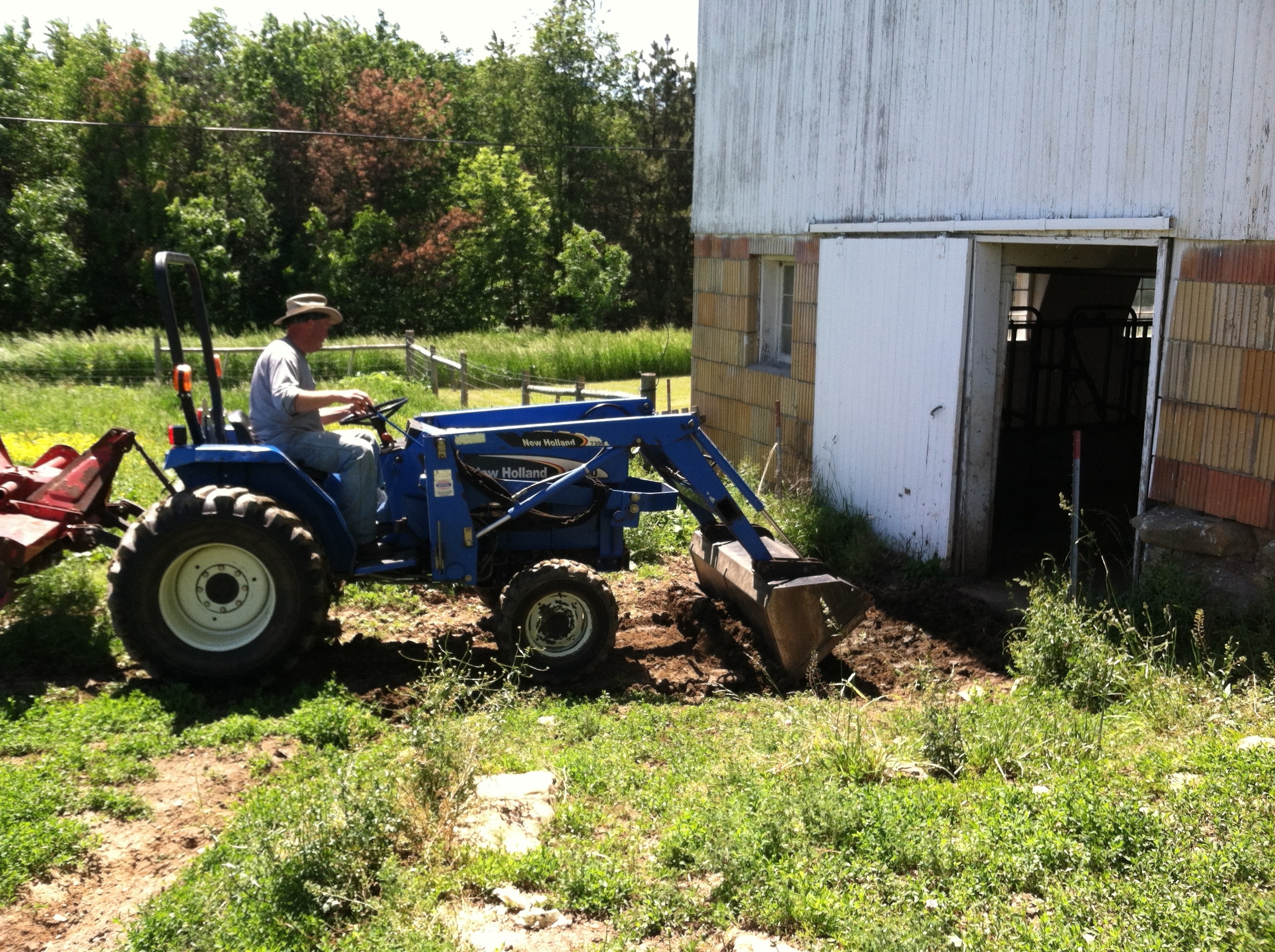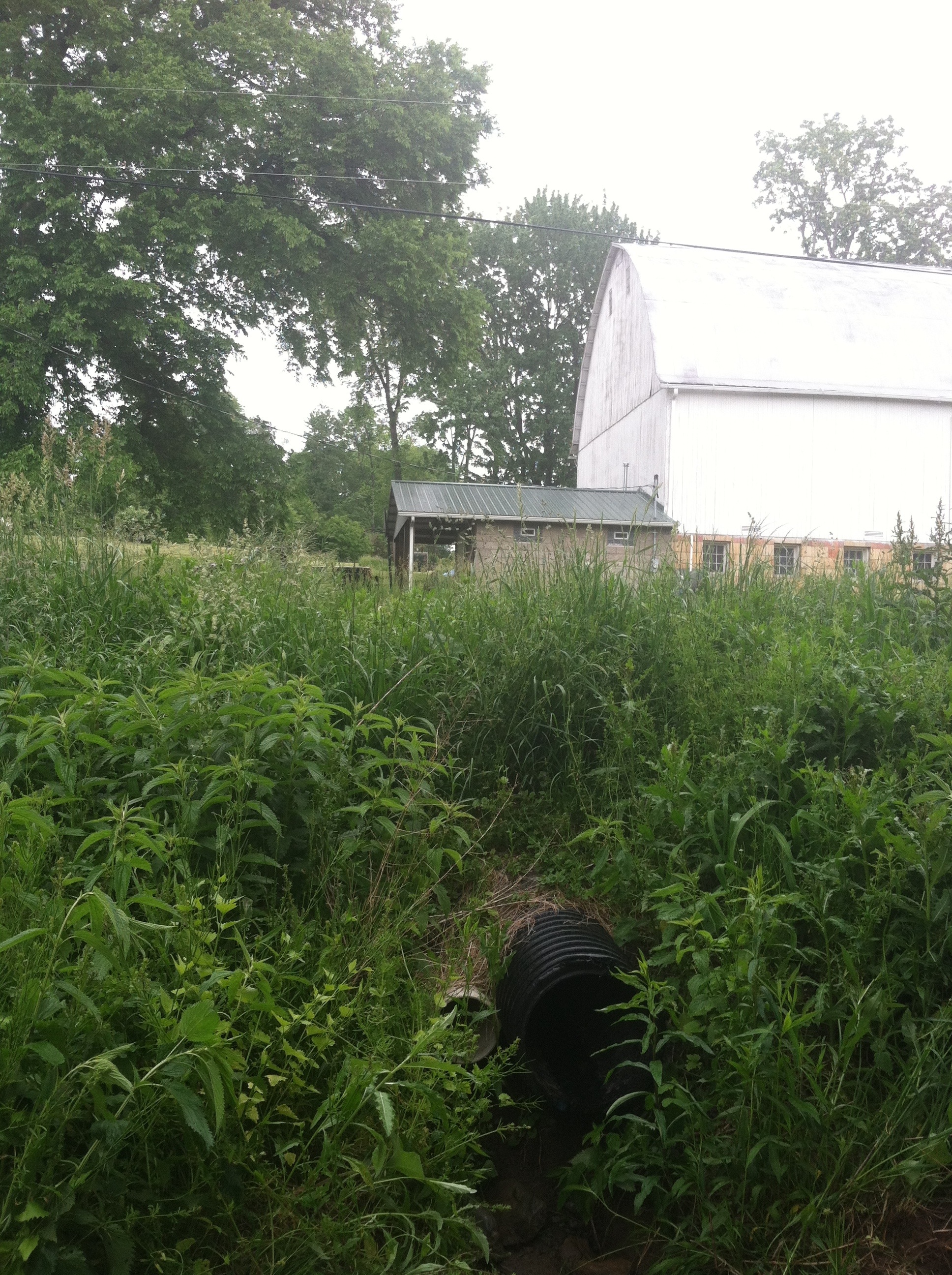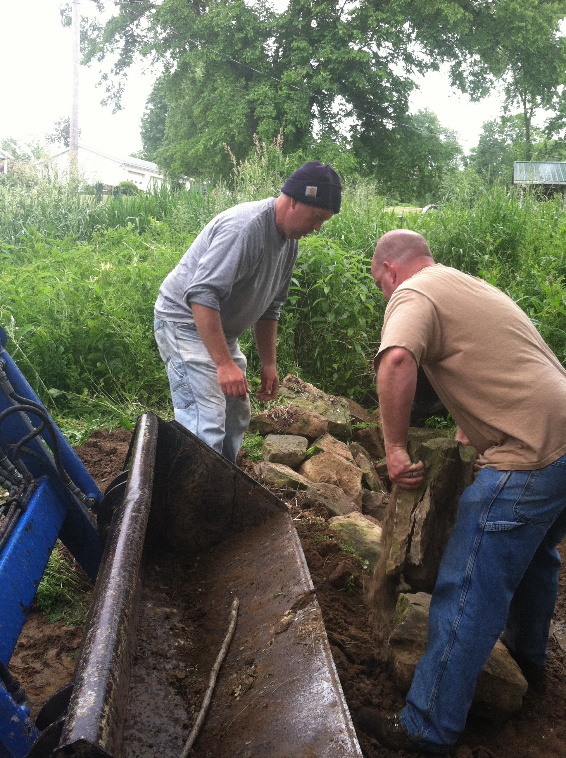 Next Mike headed across the road to begin the “end phase” of the last part of our EQIP grant. Can’t wait to be done with our contract – it’s been a l-o-n-g six years. This phase entails creating a filter area to catch the water from our milkhouse drain. When a road crew came through a few years ago to replace a culvert, we asked if they would bury a conduit for us. Thankfully, they agreed! Since our contract is up this summer, it’s time to wrap things up. ๐