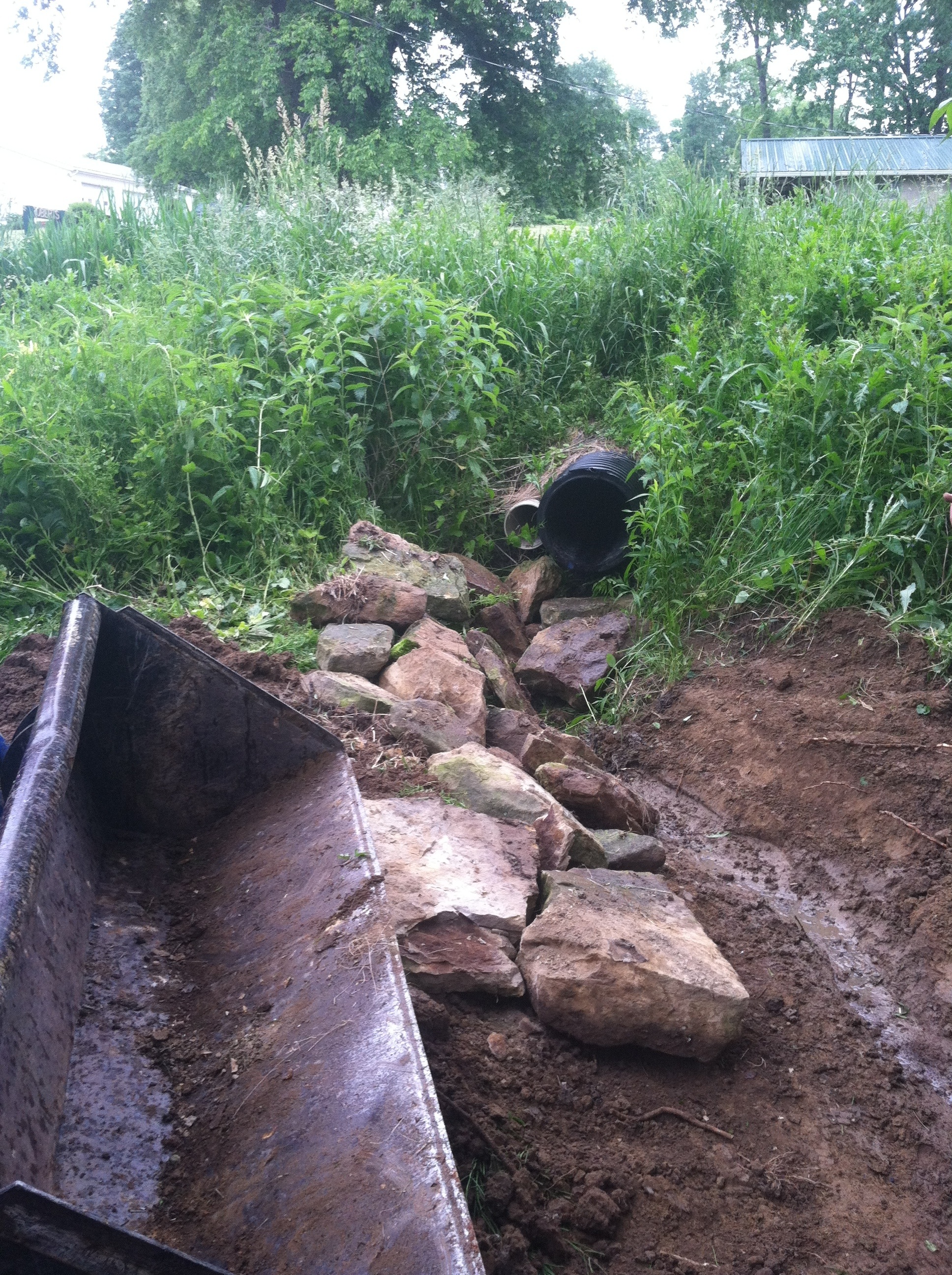 These rocks by the milking barn have been causing water to leak into the corner of the barn. A better place for them is across the road, lining the trench… (Killing two birds with one stone ? Ha!) ๐