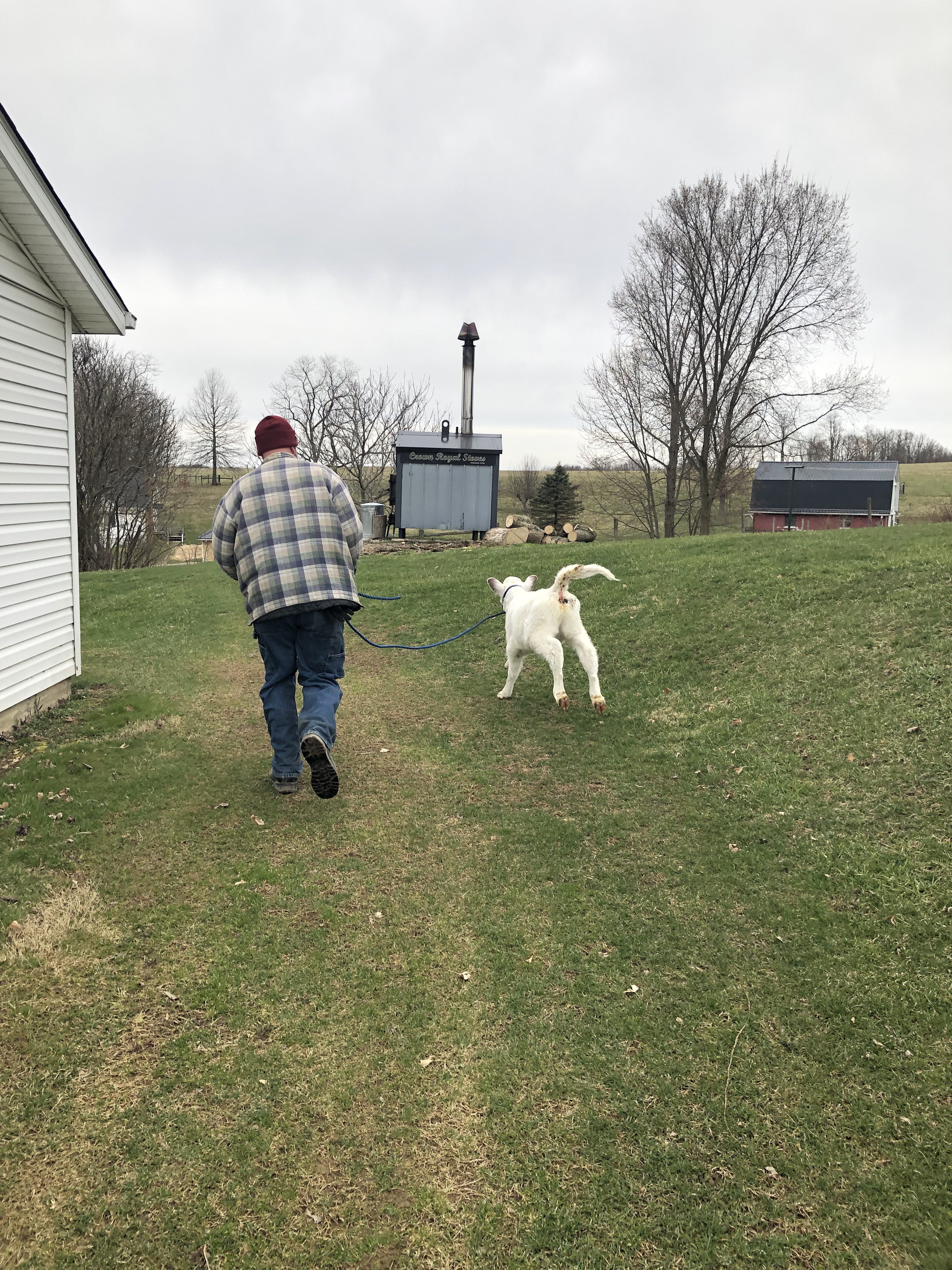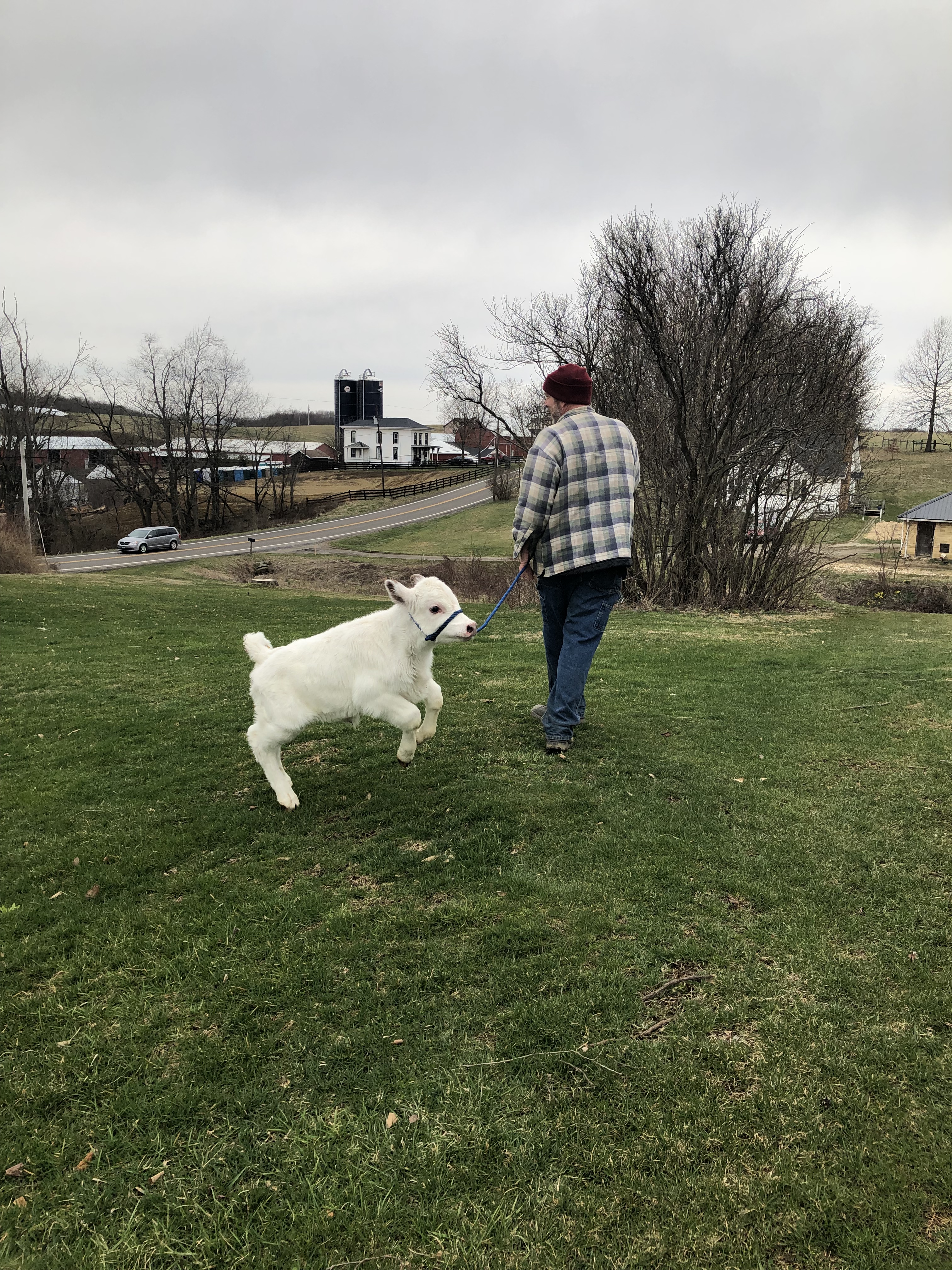 Next we wanted to start walking everybody down to the barn as usual. This is when we realized it would be nice to have an extra set of hands to help. Fortunately, Michael hadn’t left for work yet, and was able to join us for this fun.😉