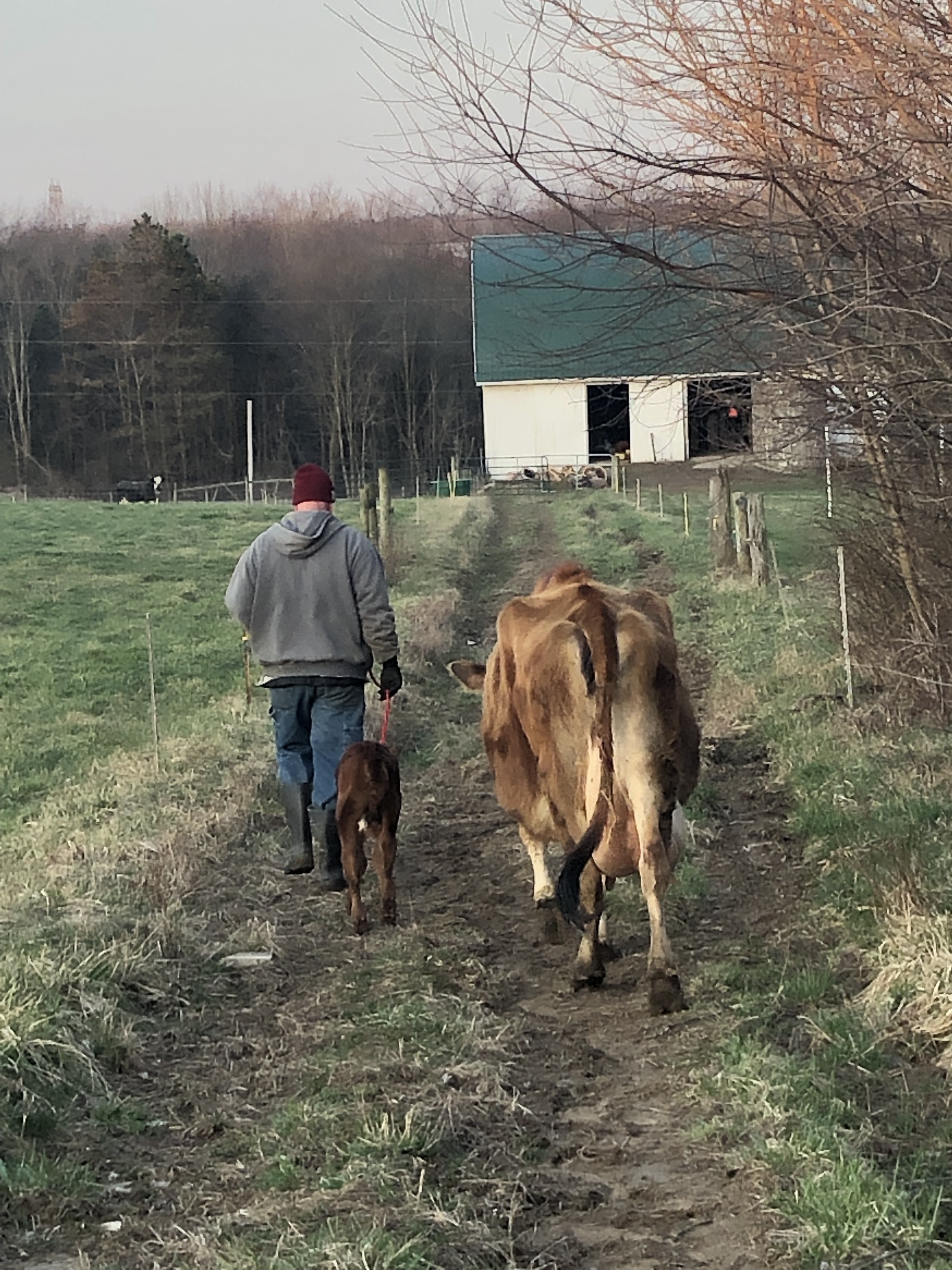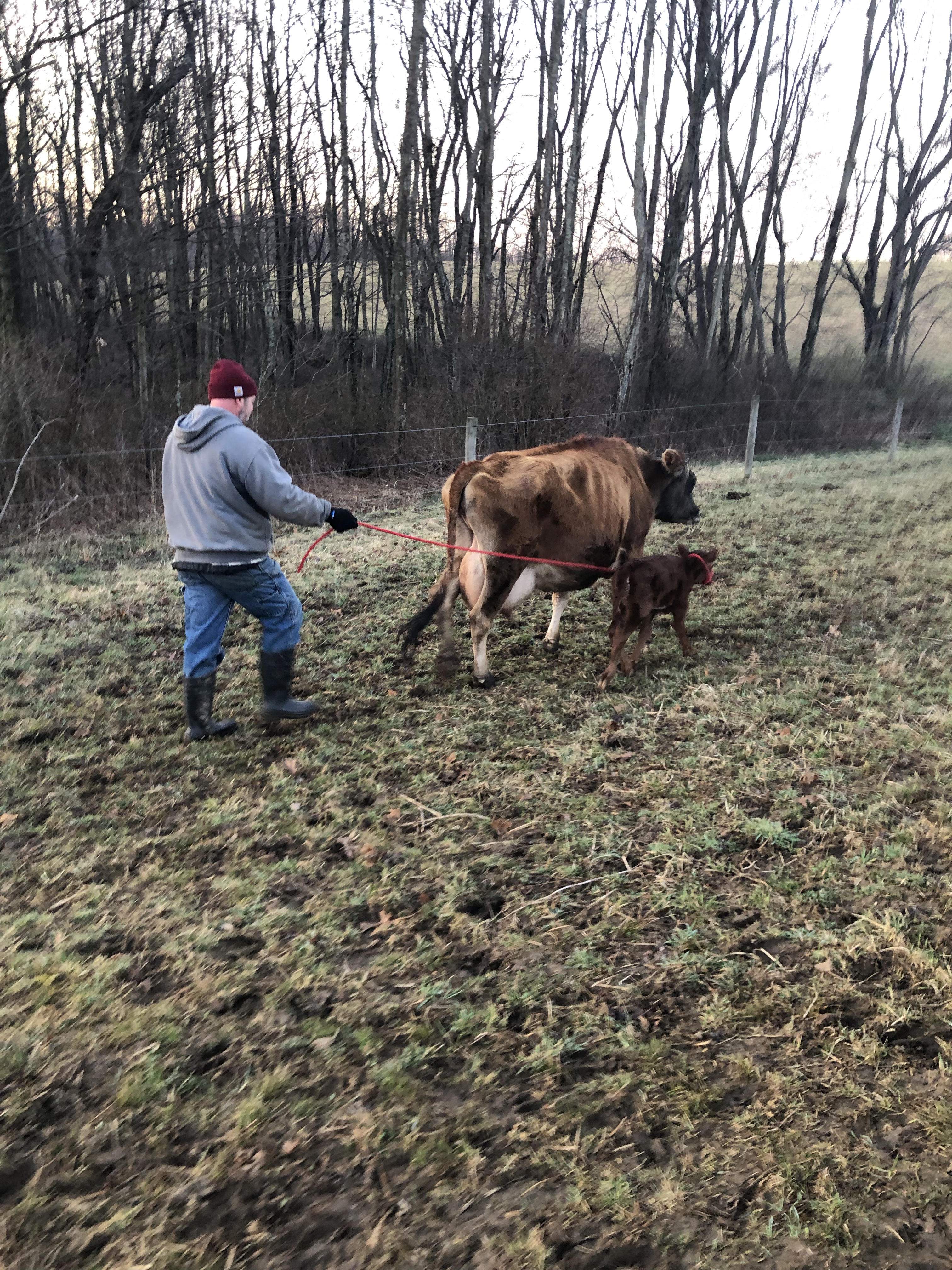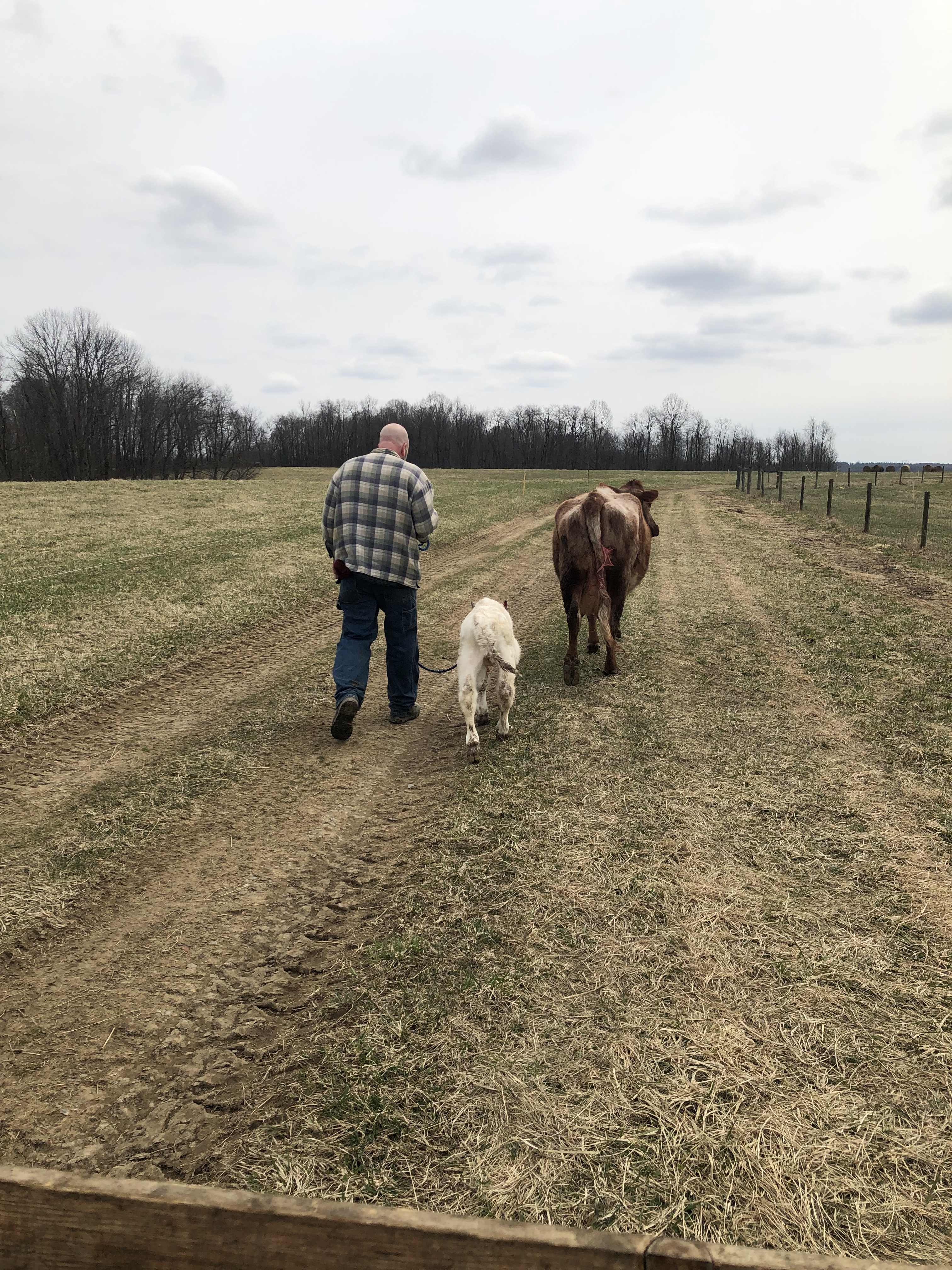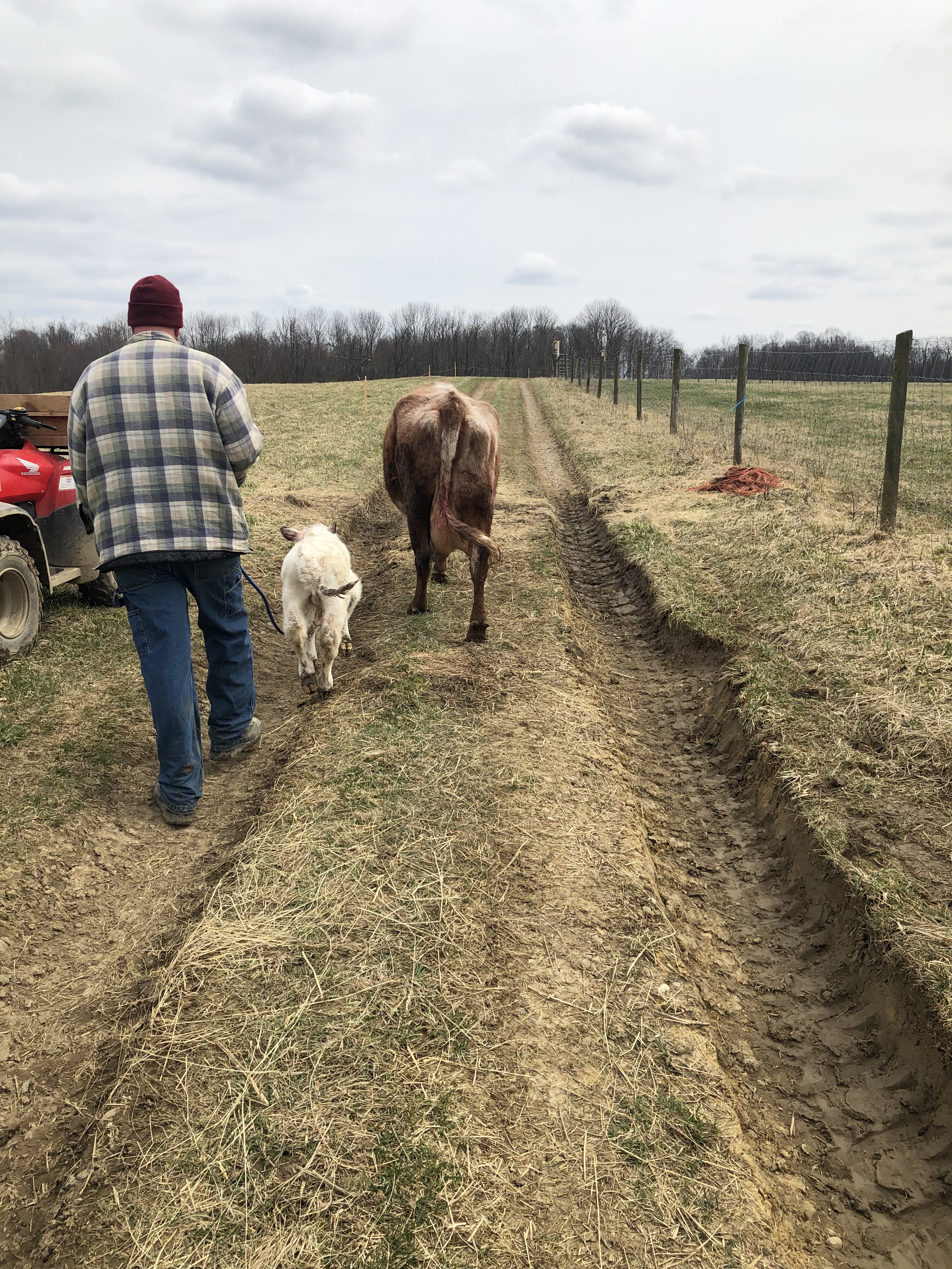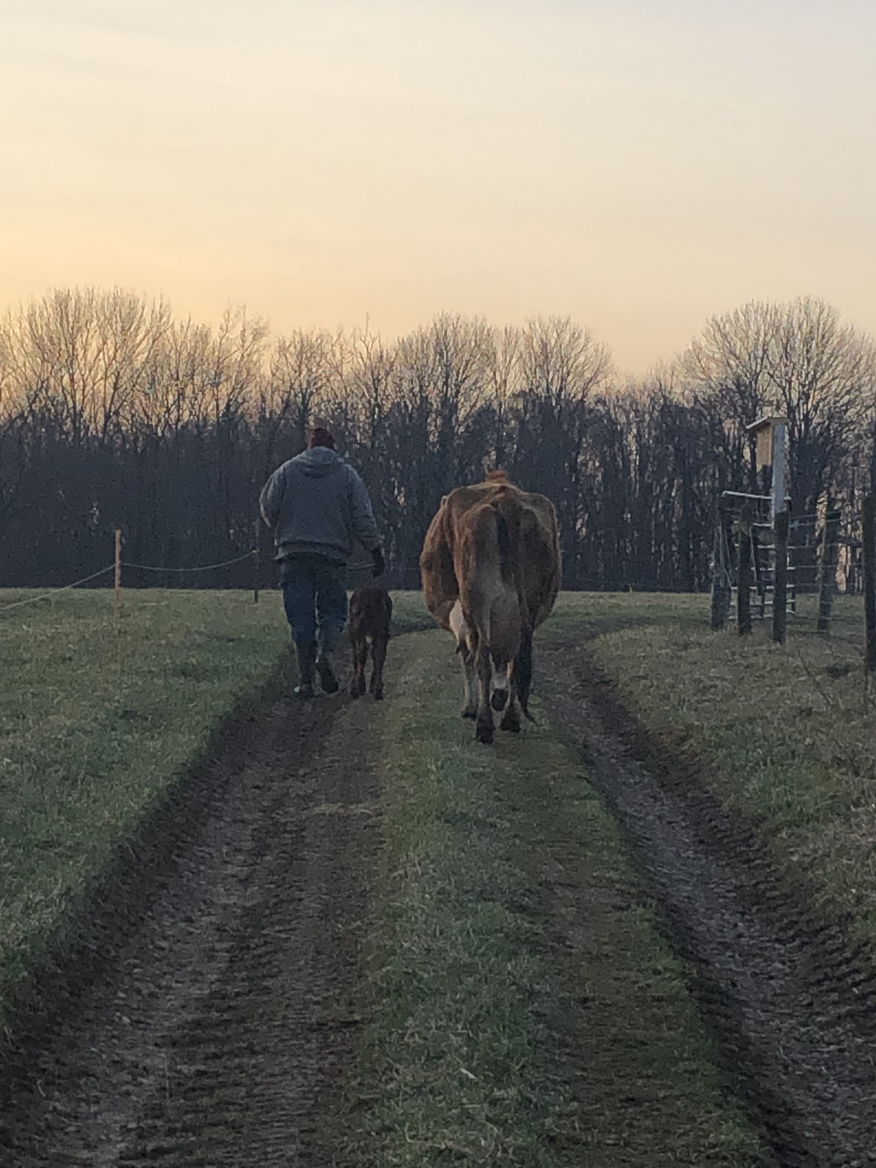 Then Mike took Jarjar from me, and walked him with Gluey & Ruby toward the barn. At this point, BOTH mamas thought Jarjar was their calf, lol.🙄