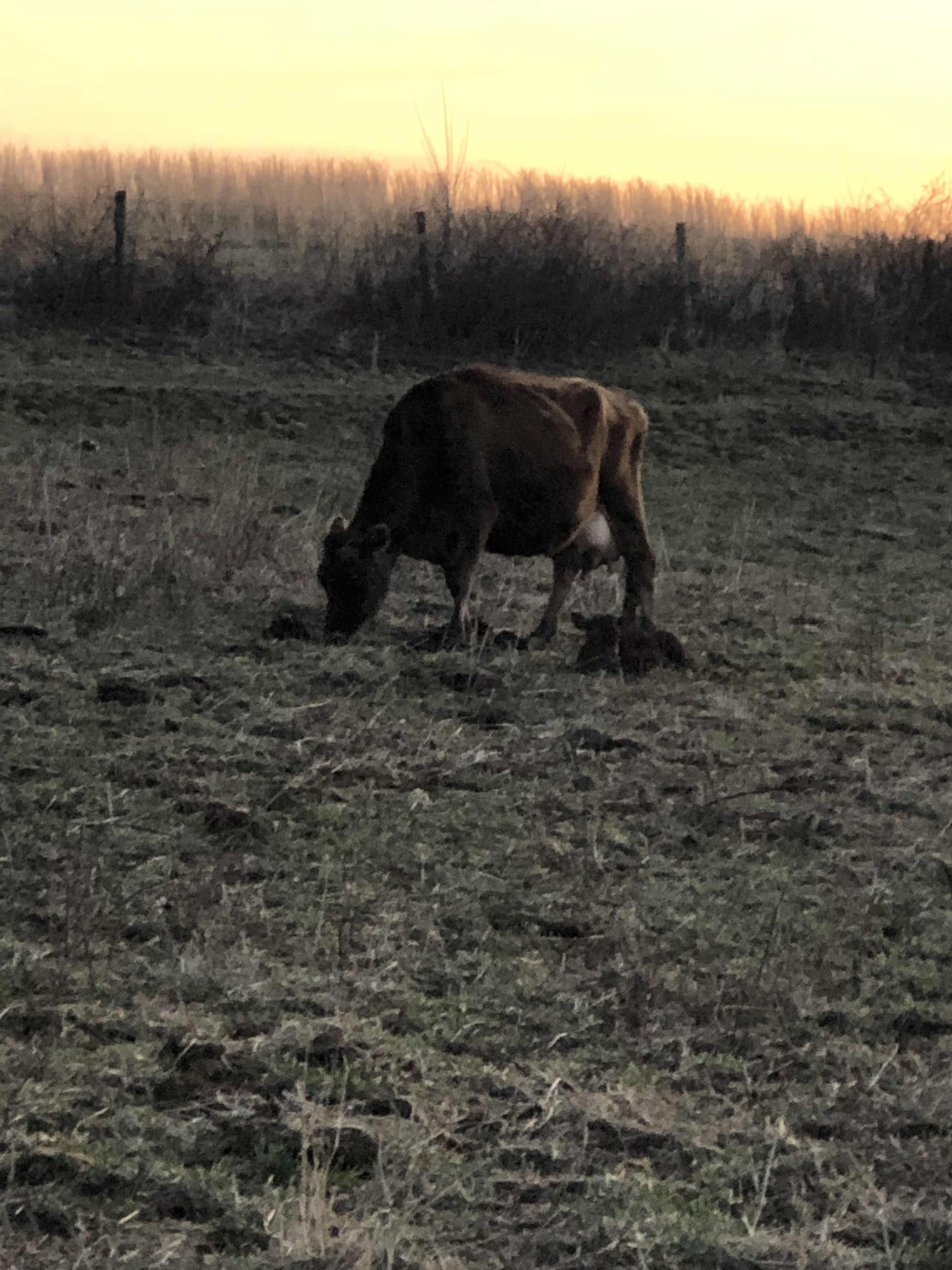 As I’m taking pictures and videos of all this with Ruby, all of a sudden I hear a weird noise behind me. I turn around to seeing Gluey laying on the ground and pushing for a few seconds and then she popped up and started eating again. I asked Mike if he thought maybe Gluey was going to have her calf today, too?🤔🤷🏻♀️ Time would tell…