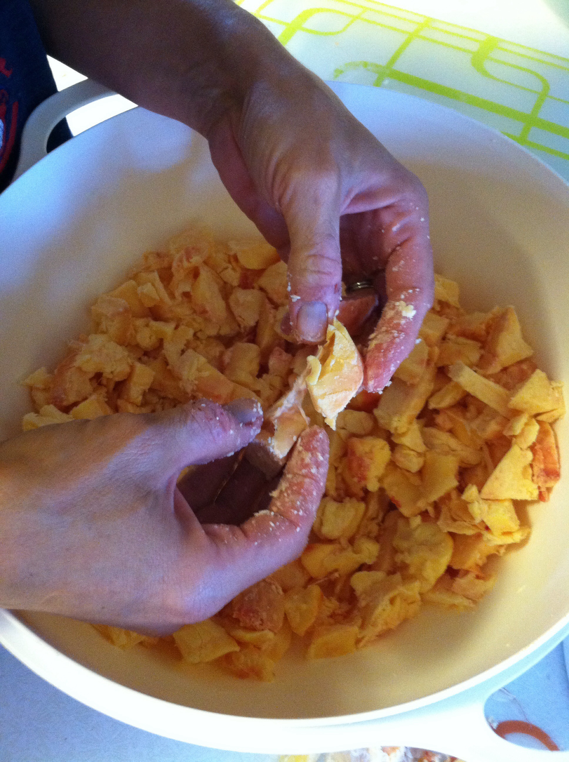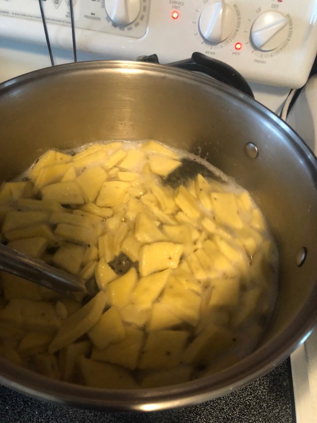 Next I boiled them for a l-o-n-g time. Like an hour and a half… Didn’t mean to, but I forgot about them as Mike & I were having so much “fun” cleaning up our basement, lol! Didn’t seem to matter, though. They weren’t too mushy to peel & they mashed up really easy… π