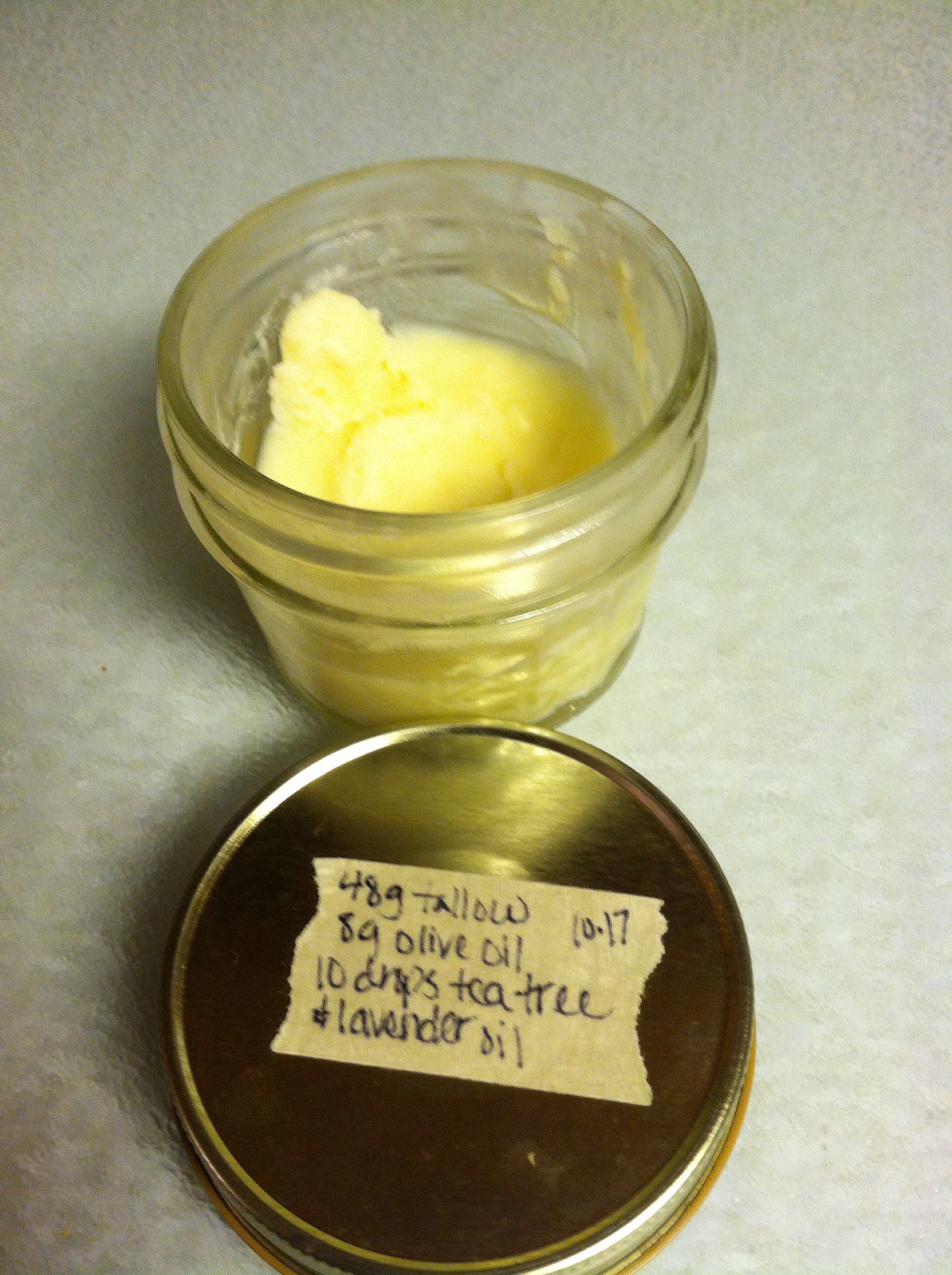 After reading this article about how wonderful tallow is for your skin, Angie & I experimented with a tiny batch of tallow balm. We added some olive oil and some of her therapeutic grade essential oils to it, and it is WONDERFUL. It smells amazing (lavender & tea tree oils), and feels great on our skin! It is definitely a “balm” – not super squishy like a lotion, but once it’s rubbed on the skin, body temp “melts” it and it becomes easier to spread. Definitely something I’d like to do more experimenting with – in my free time – [sigh], lol! π