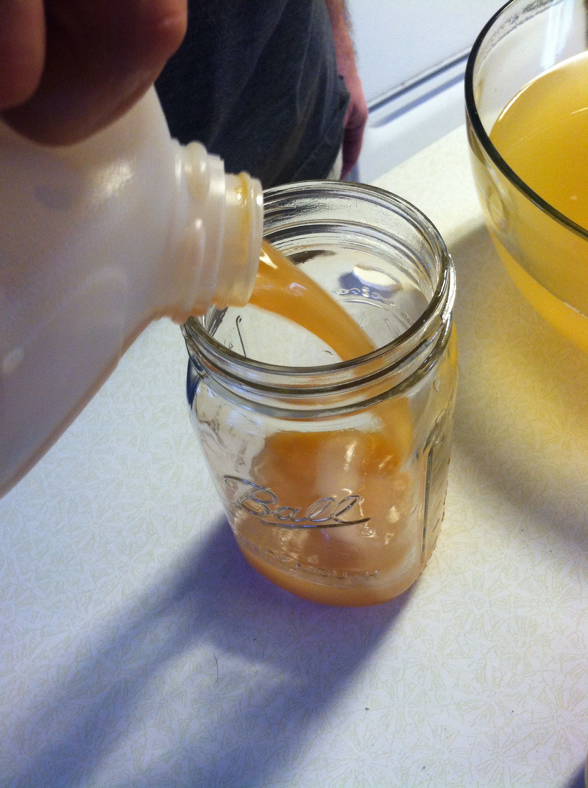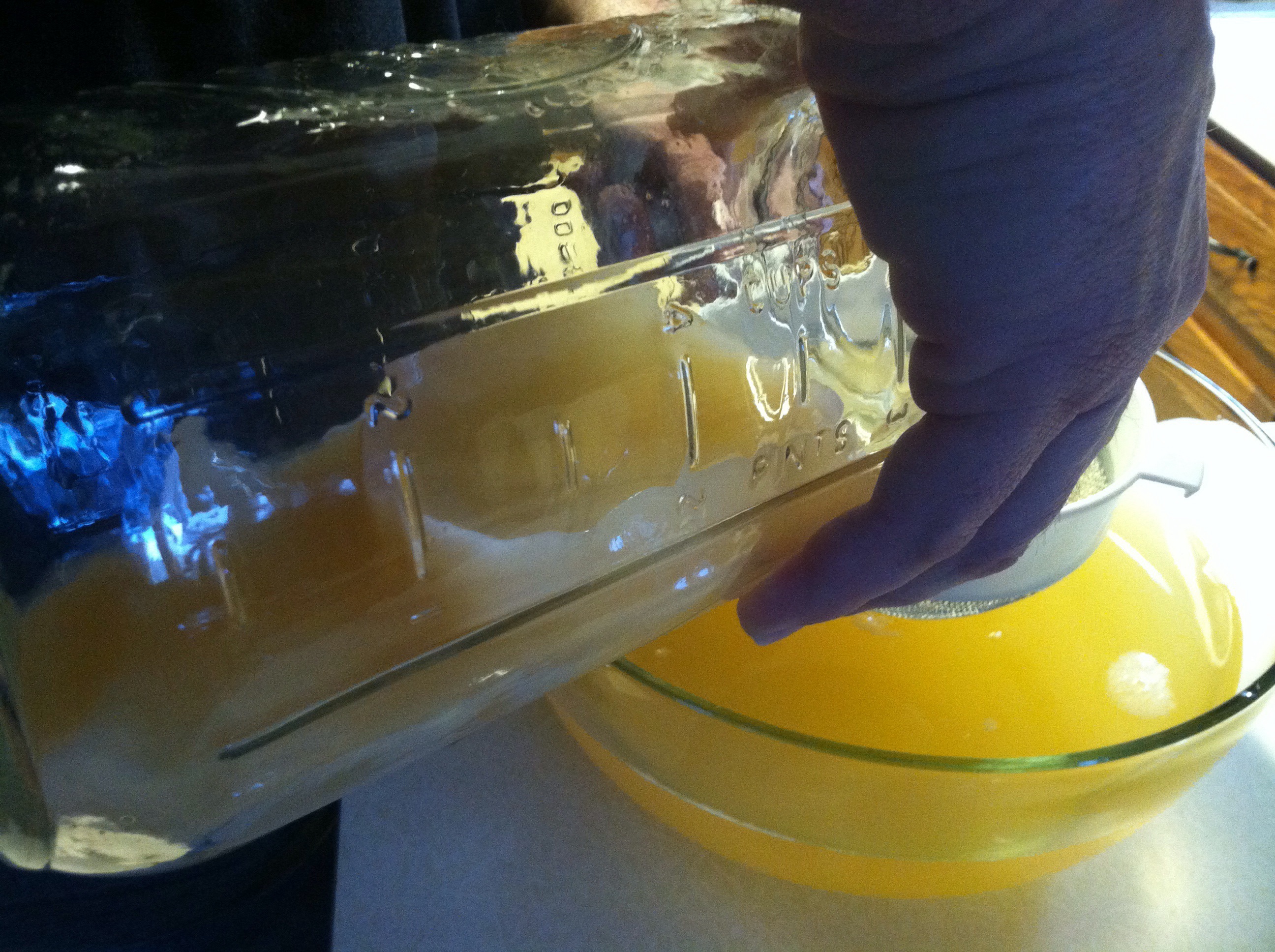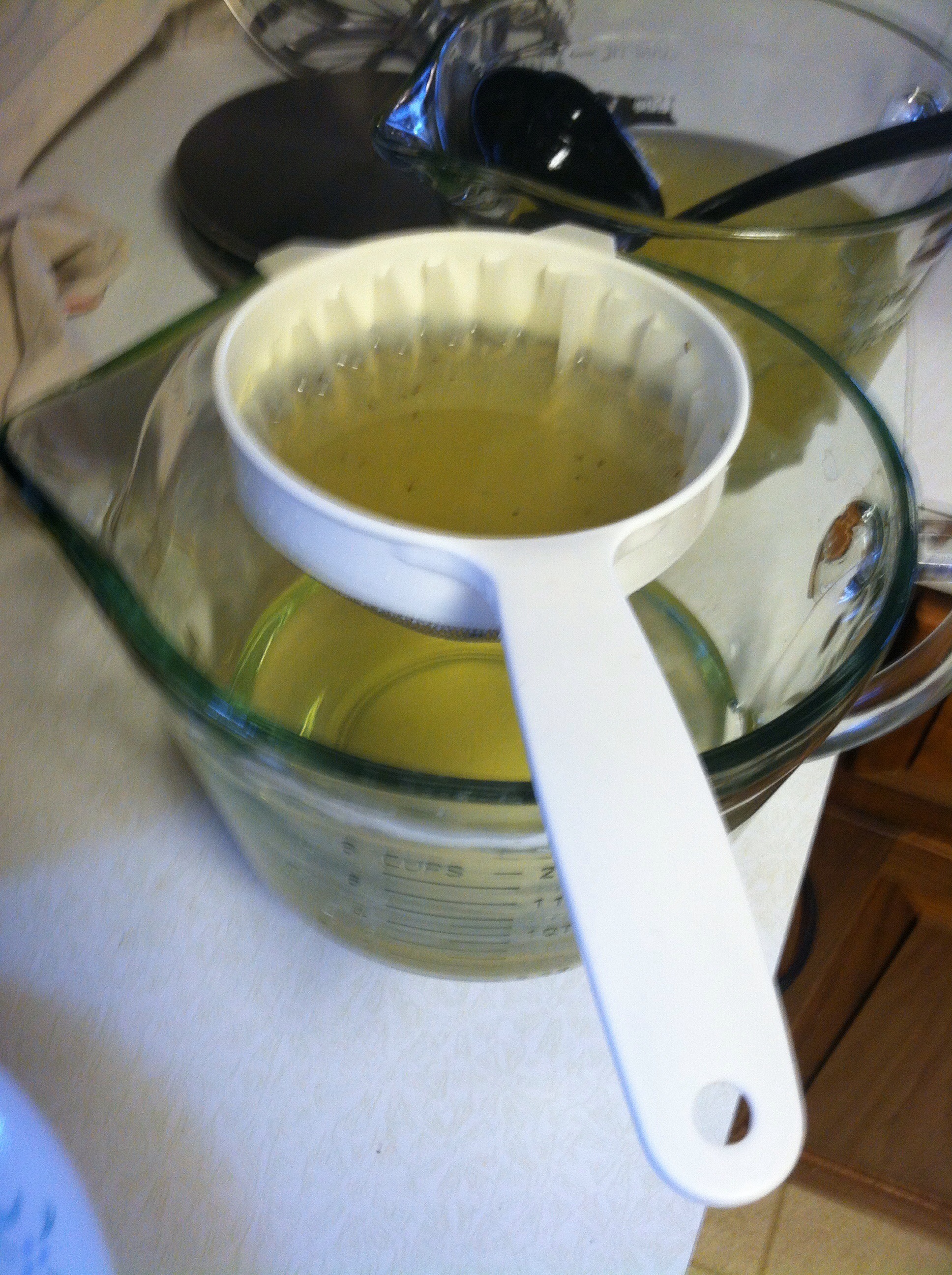 After a good 6 hours of rendering, it was finally done as the solids went to the bottom. Next step would be to strain it into jars. *KEY NOTE* Tallow will strain better/quicker if it is HOT. This was not a problem with the turkey fryer batch – we got it all strained before it cooled. Not-so-much with the Day #2 batch. Definitely didn’t have it hot enough for long enough, so it was more of a messy chore “fixing” it. Lesson learned! π