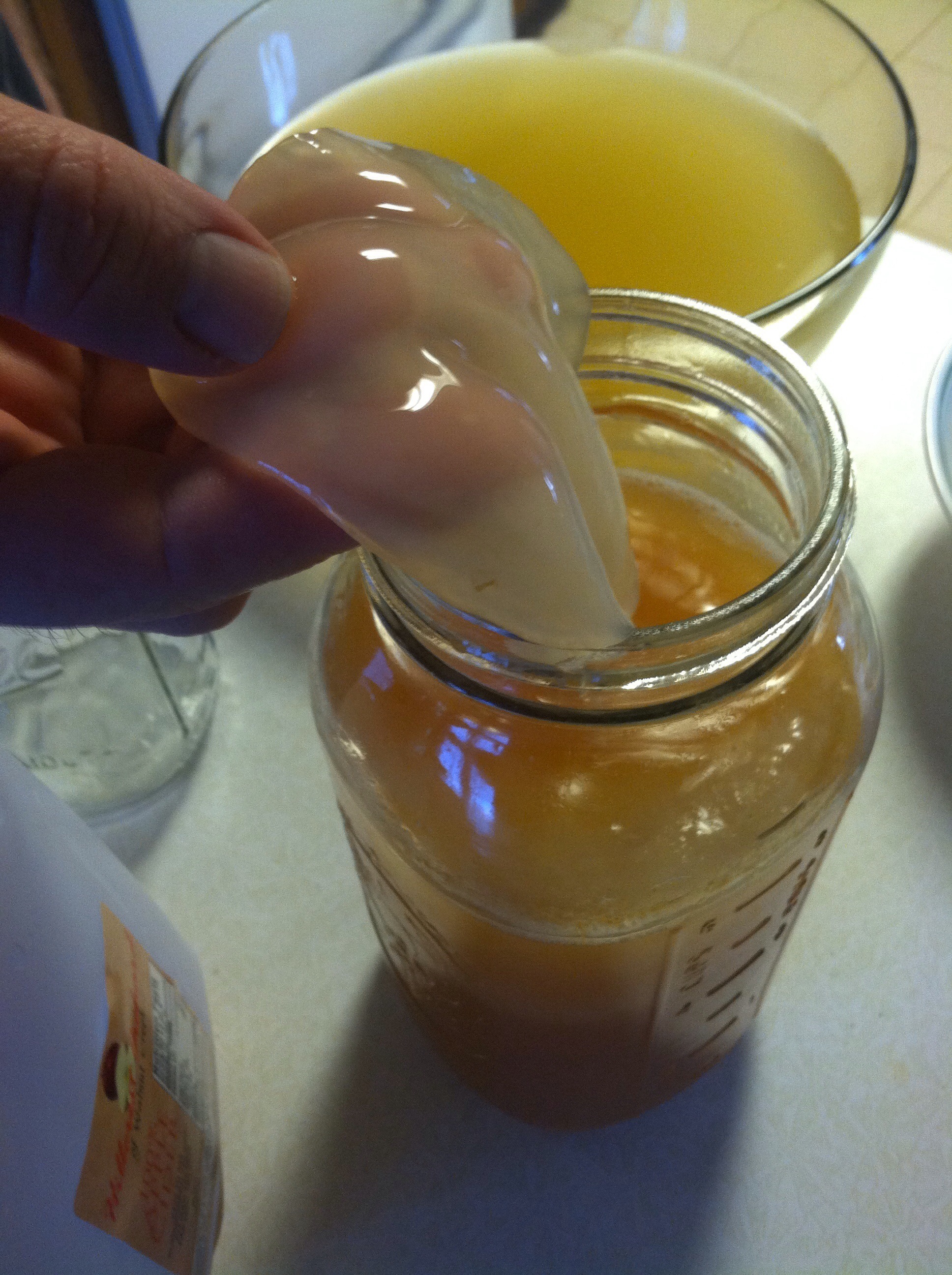 Here’s the “mother” from the good batch in the new raw apple cider – I forgot to take a pic of it when it was on the plate, but you can see how much nicer/thicker it grew… π