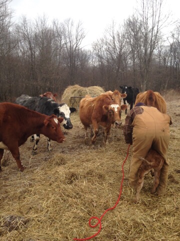 Roni is slated to have the next calf. April 18th is her due date – BUT – when we went up to check on her this evening, we noticed the birthing process has begun!๐