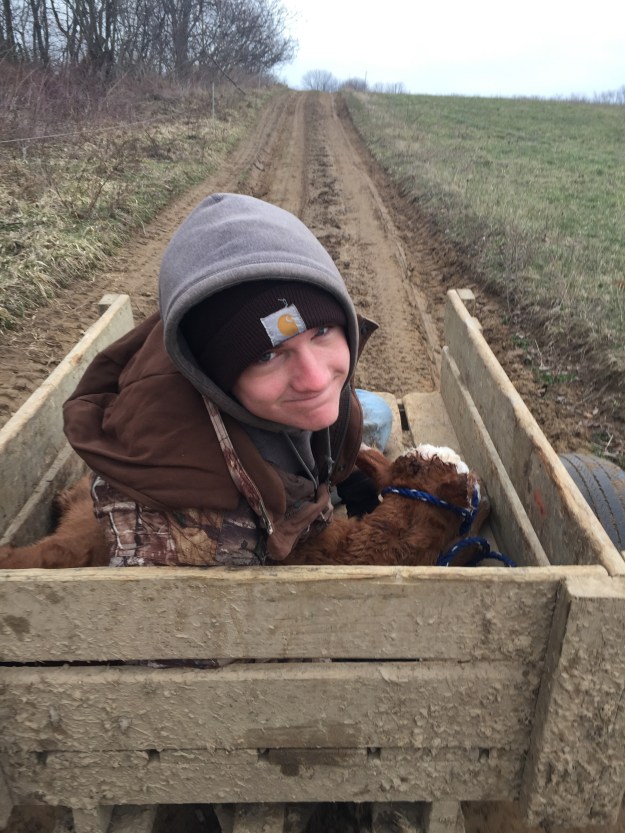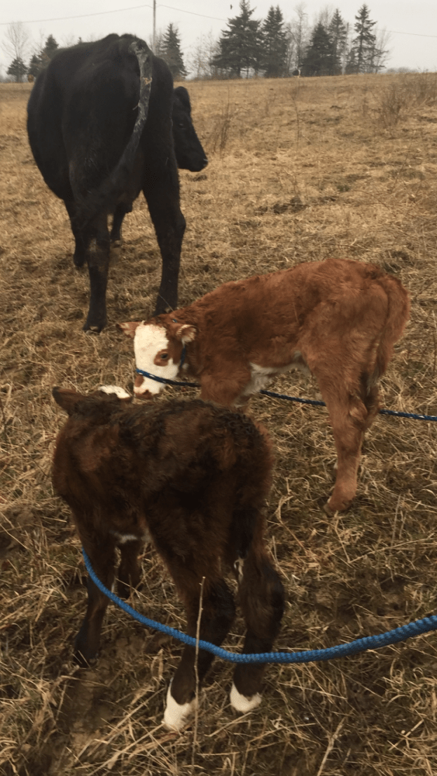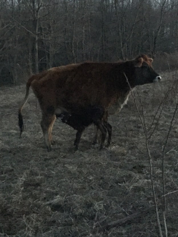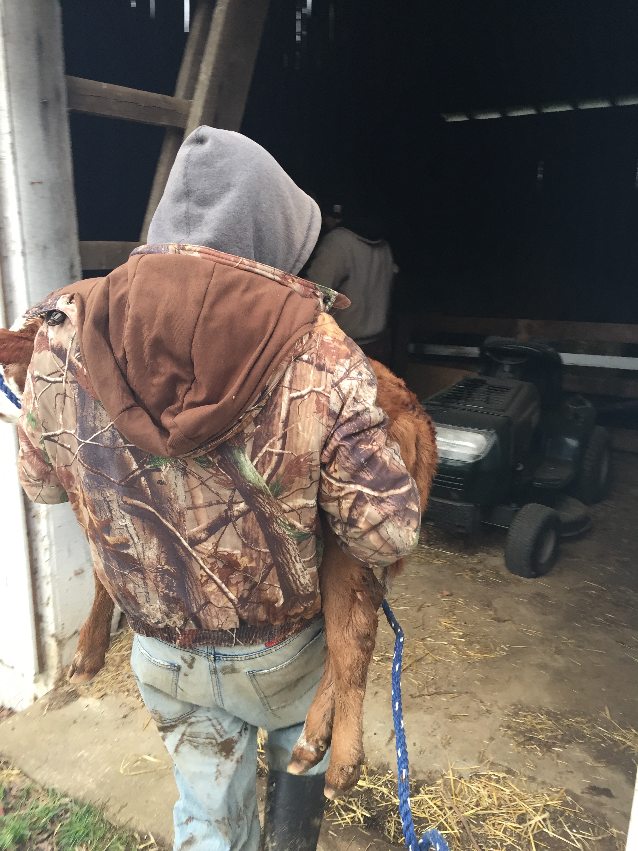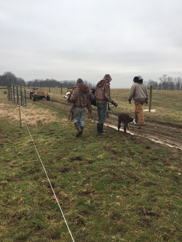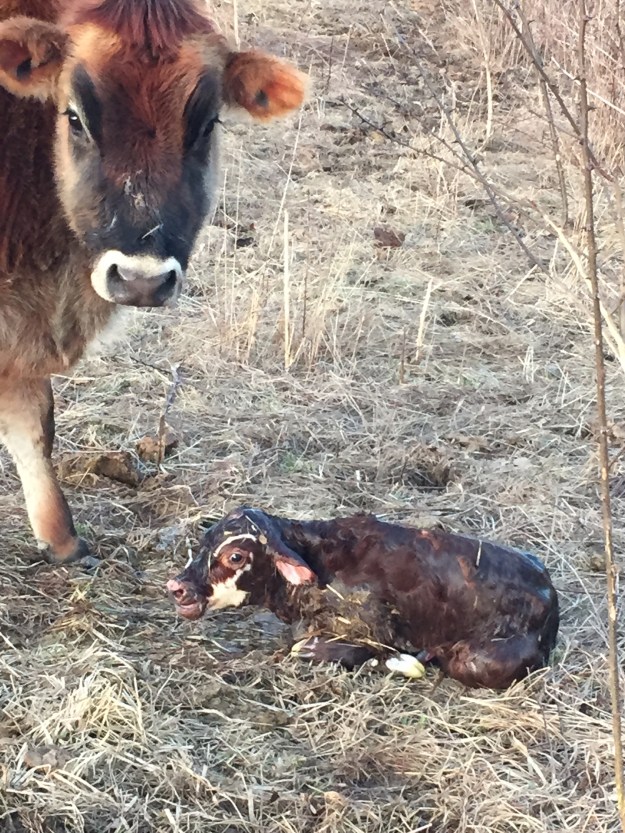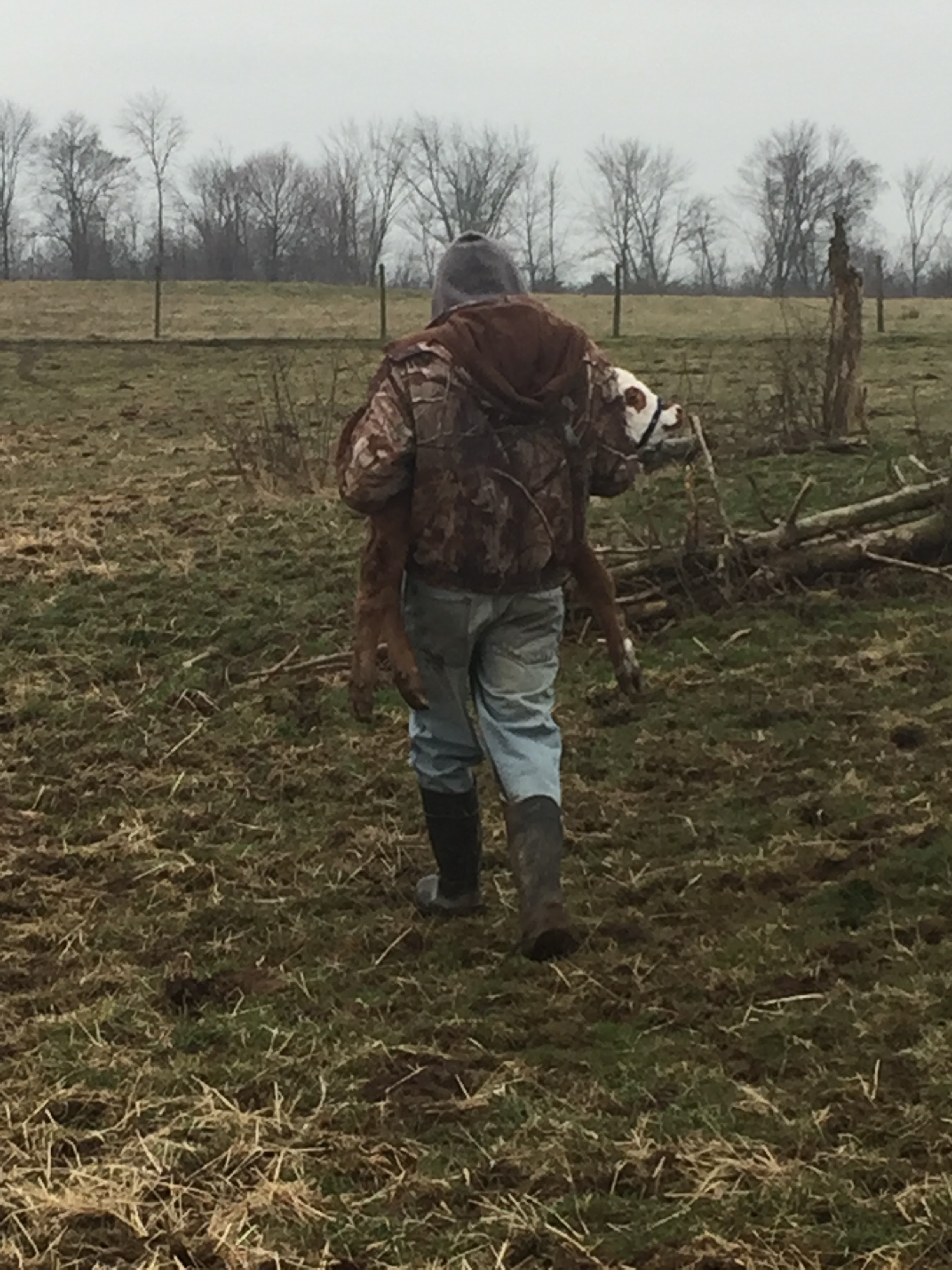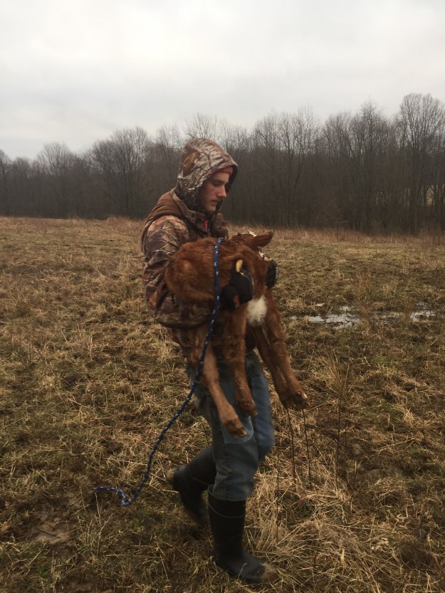 Next step was to bring Chewy & Fiskars down to the barn. Chewy was THE most laid back and calm calf we have ever had, lol. His tummy was full and he had ZERO ambition to walk ANYWHERE… By the time the 4 of us were ready to bring them down, Fiskars had stashed Chewy in the briar patch. That was fun getting him out, lol…๐