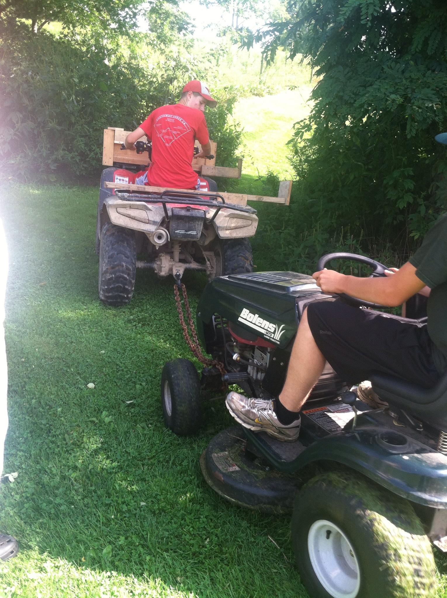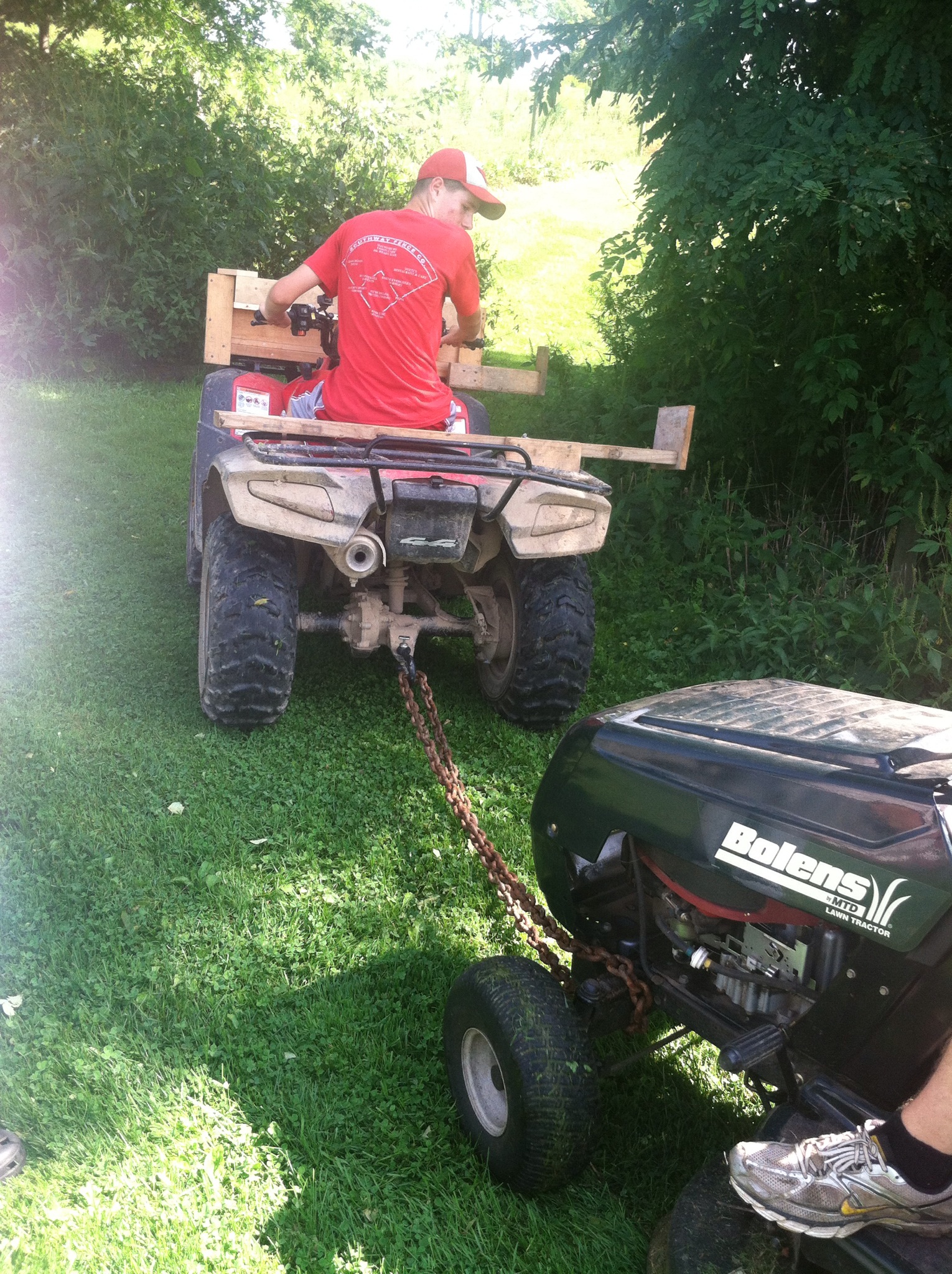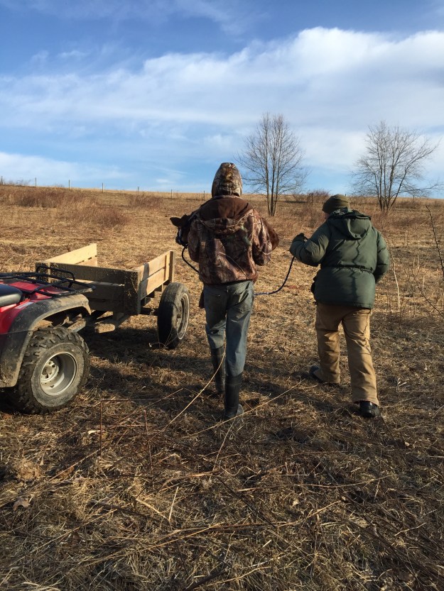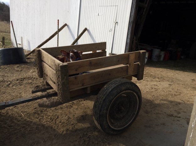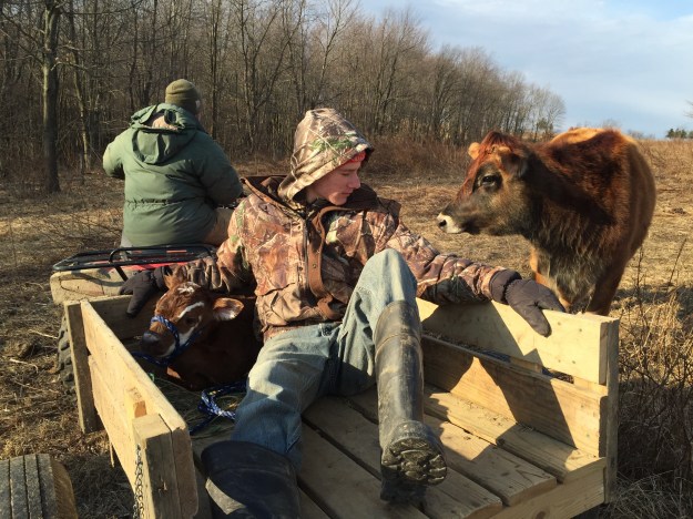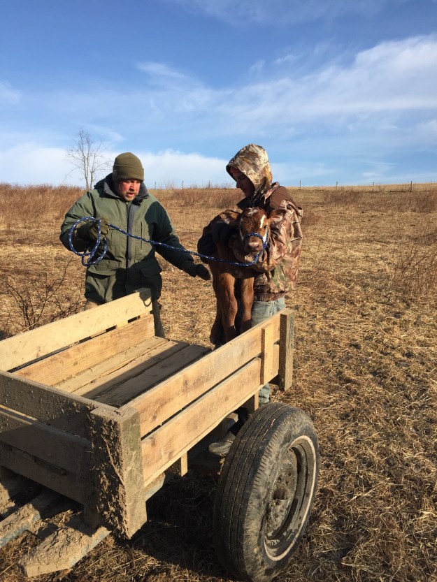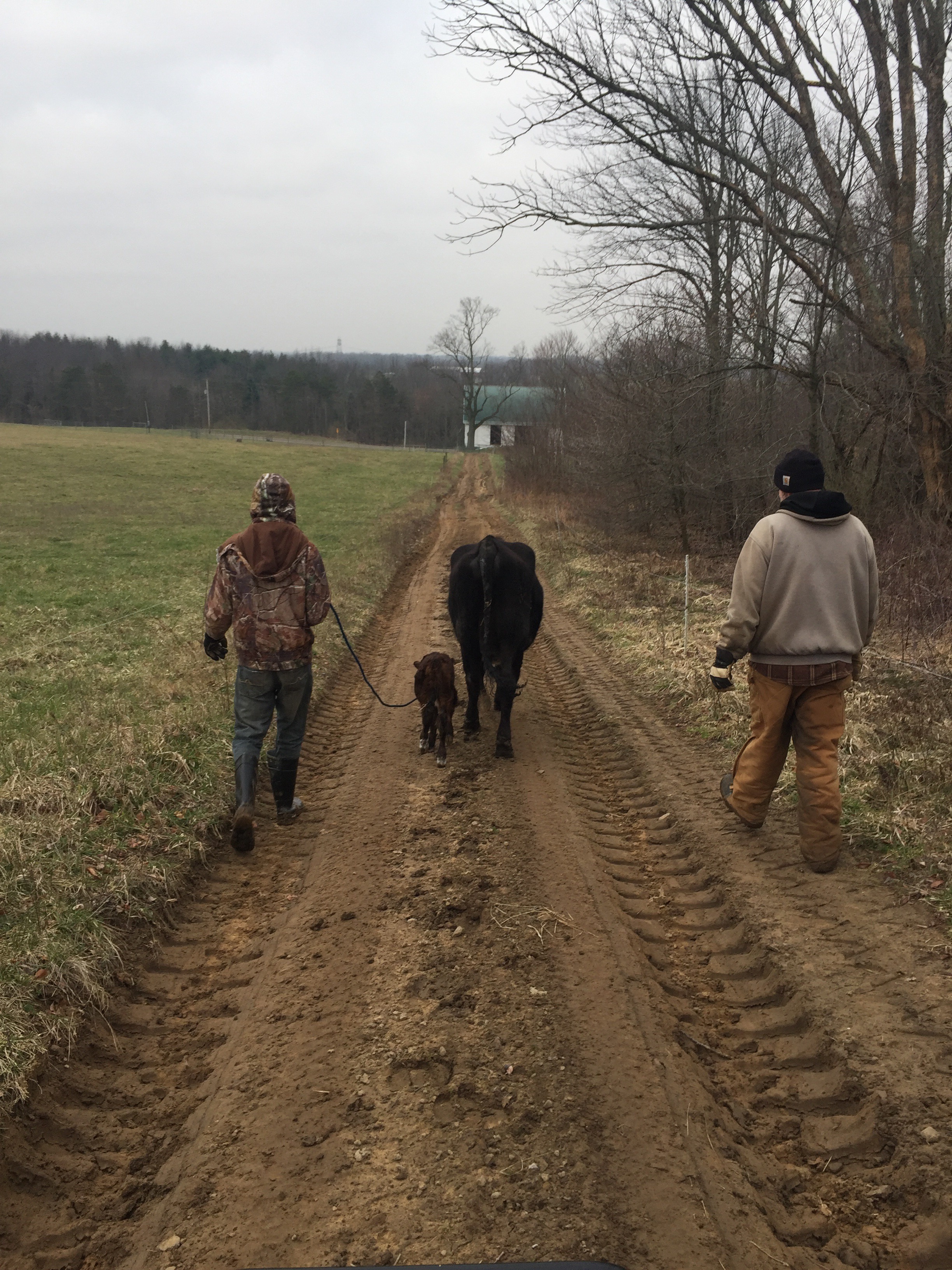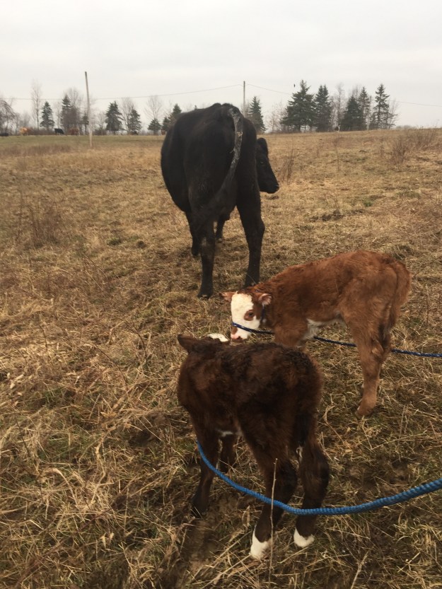 Next step was to bring Chewy & Fiskars down to the barn. Chewy was THE most laid back and calm calf we have ever had, lol. His tummy was full and he had ZERO ambition to walk ANYWHERE… By the time the 4 of us were ready to bring them down, Fiskars had stashed Chewy in the briar patch. That was fun getting him out, lol…๐