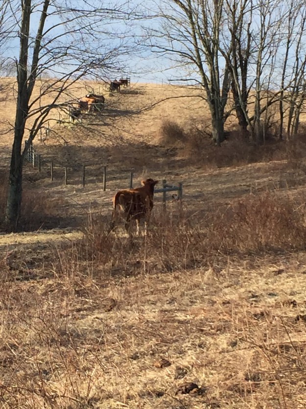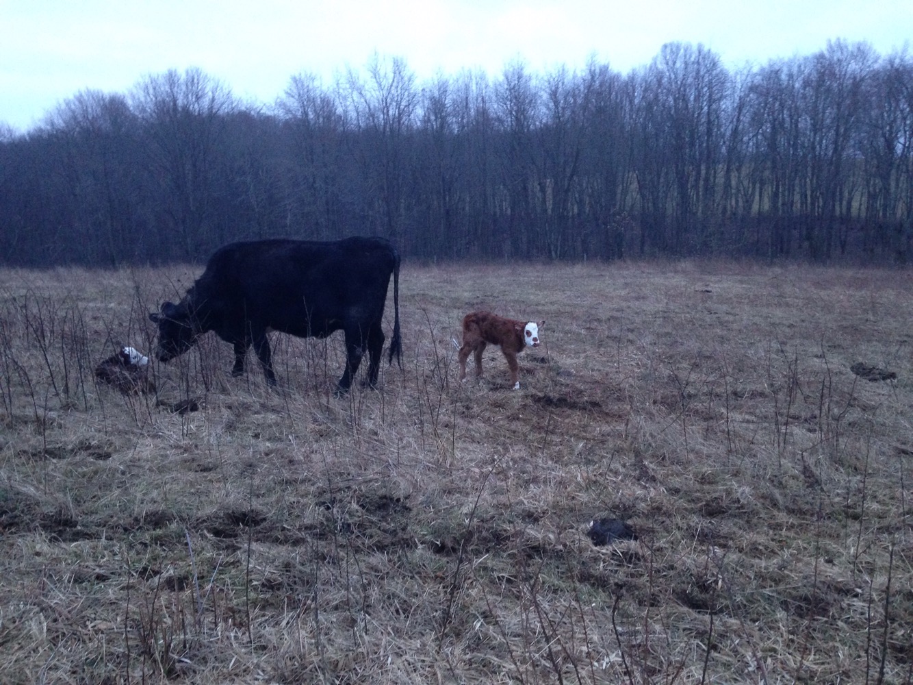 Decided to leave it be until we had the halter and the boys to help bring them down. So Mike headed back to the barn, and I waited up in the field for them all to come back. Here is RedRobin staring at where her calf was laying from her side of the fence.