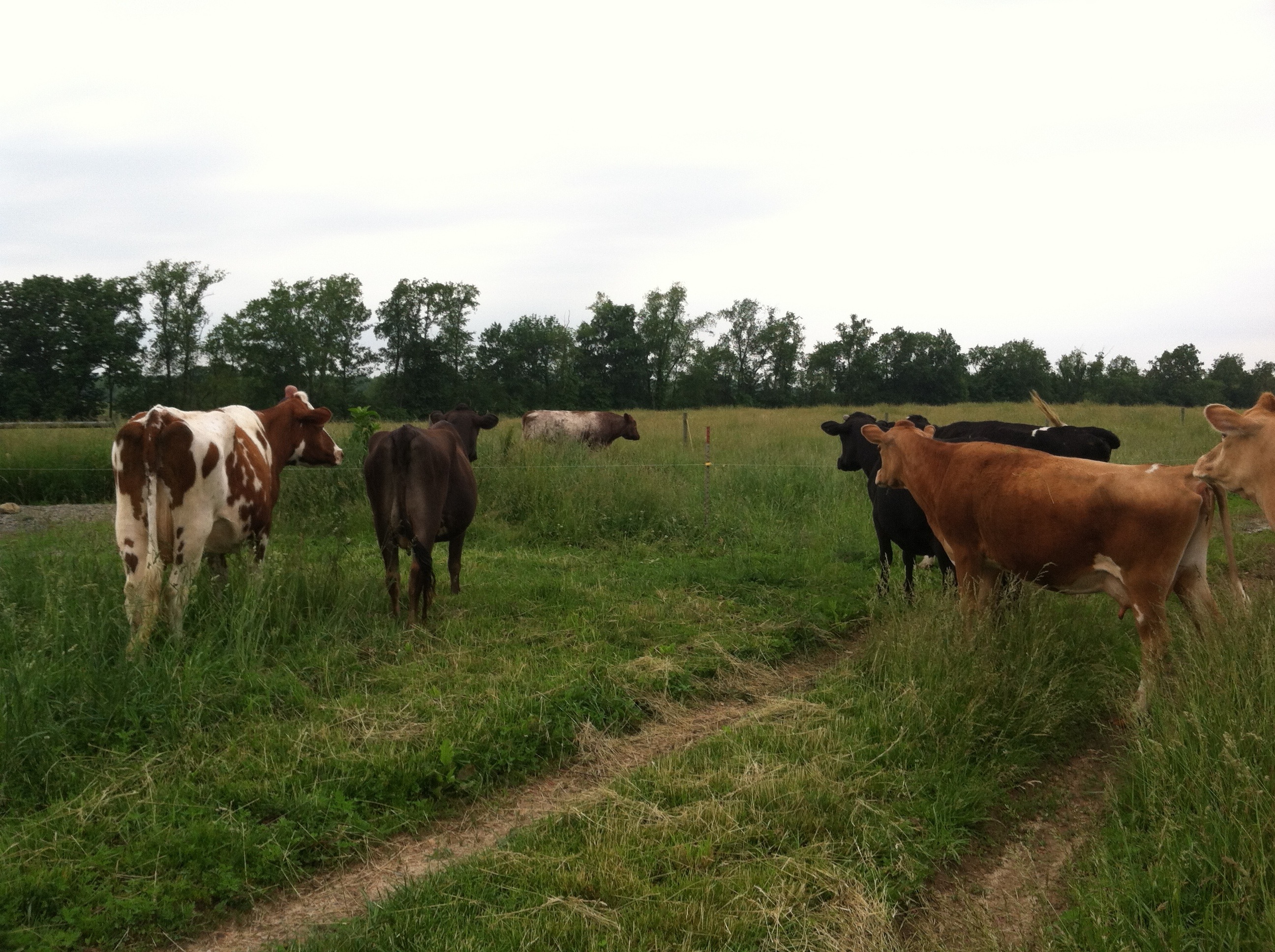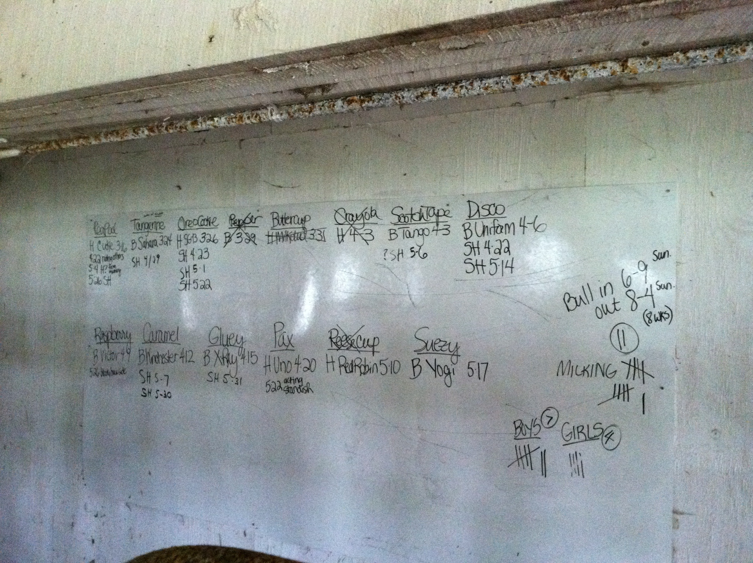 We’ll keep Cleatus with them for 8 weeks. In the past, we’ve done 12 weeks, but we’d really like to close our calving window a bit. We keep track of the girls’ heats on a big piece of glassboard in the milking barn. When the vet comes this fall to pregnancy check the herd, those dates help us determine their due dates. π